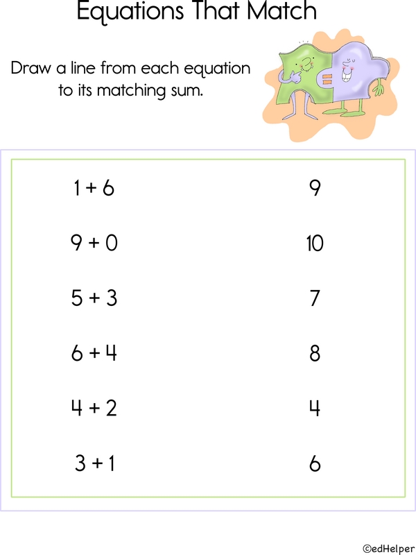 Welcome to the Equation Party! On the left are the addition expressions. On the right are the answers. Draw a line to match each one. All done? Great job, Math Cupid!
