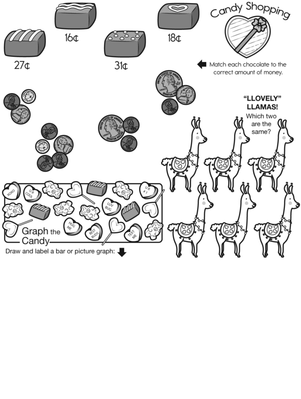 Ready for some fun number games? You'll solve a cross number puzzle, practice division, go candy shopping, make a bar graph, and find matching llamas. Grab your pencil to unlock the fun!