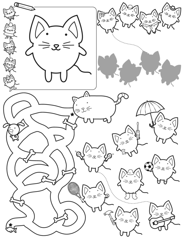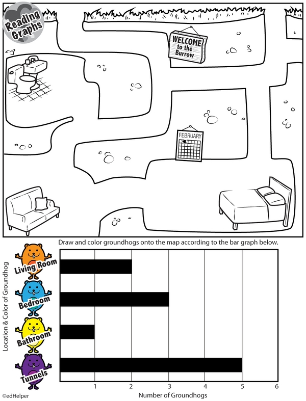 Ready for some puzzle fun? On page 1, look at each number and fill in the blanks. Next, dive into two pairing activities - one to find the exact match and the other to pair similar actions. Remember to help the kitten travel through the maze to reach the fish treat. Finally, on page 3, study the bar graph. Can you use the information to draw and color groundhogs onto the map?