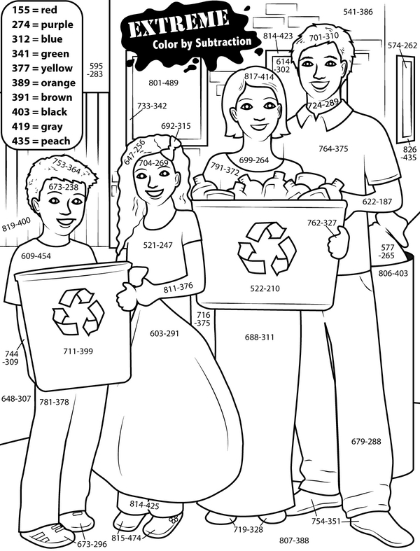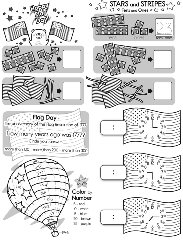 Looking for some math challenges? First, let's work on fractions. Study the example carefully, then shade and compare the two fractions in each set. Next, count the stars and stripes. Before turning the page, solve the Flag Day quiz, write the time shown on each clock, and complete a color-by-number. Finally, on page 3, challenge yourself with three-digit subtraction problems!