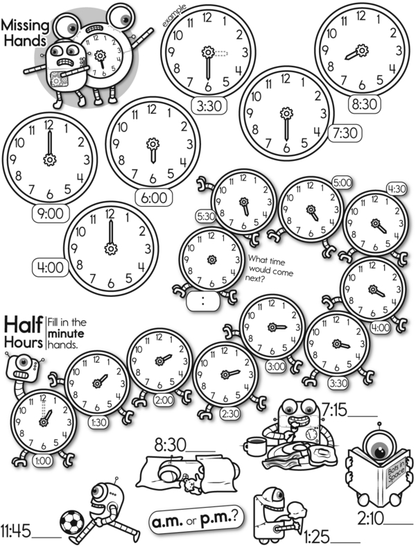Got time for some math and fun puzzles? Great! You'll practice reading clocks and drawing clock hands, counting down, comparing numbers and pictures, and helping the animals through some forest challenges. Ready? Let's get started!