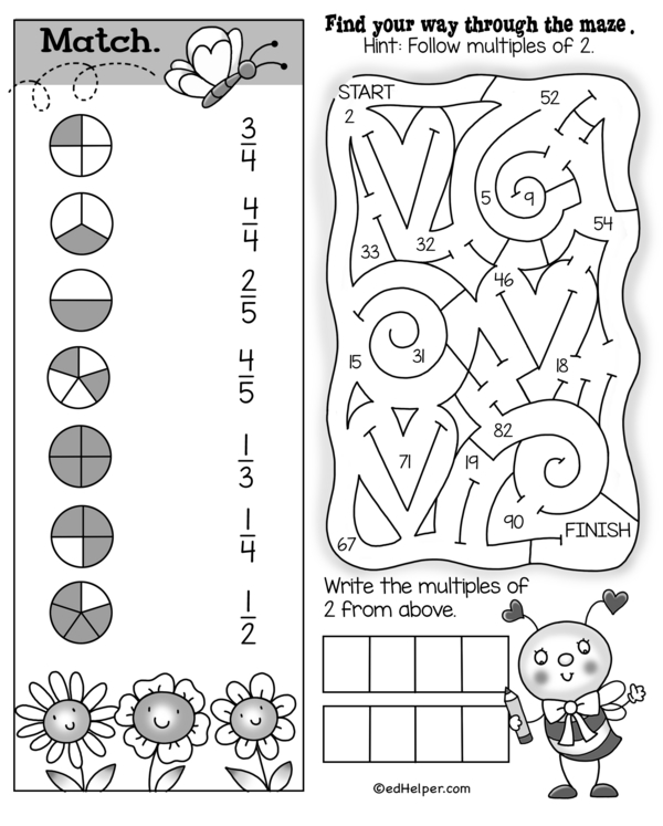 Ready for some math challenges? You'll skip-count by a thousand, subtract, divide, match fractions, and trace your way through the multiples of 2. Grab your pencil and let the fun begin!