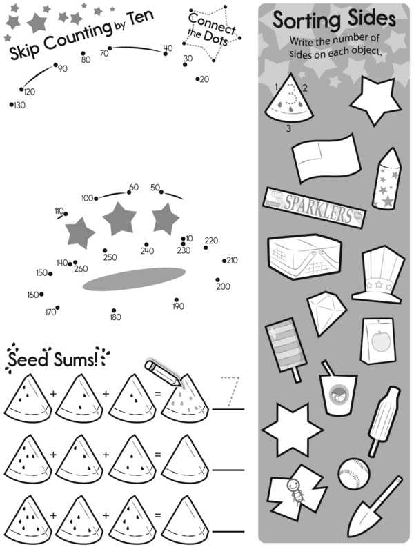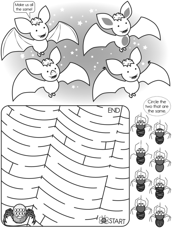 Let's solve puzzles! On page 1, shade each shape to match the fraction. Then, see how fast you can connect the dots and skip count by 10. Next, add up the seeds. Write your answers and draw just enough to match. Before turning the page, count and write how many sides each object has. Finally, on page 3, make these four bats look the same, find the pair of matching spiders, and help the tiny bug zoom through the web maze to safety!