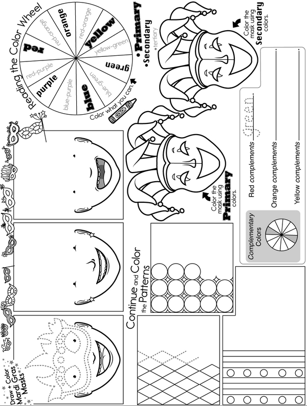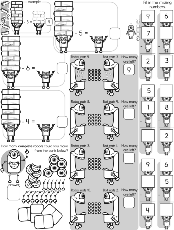 Ready for some math fun? First, solve the addition puzzles, find four matching fish, and fill in the missing numbers. Next, grab your crayons to decorate Mardi Gras masks and complete three pretty patterns! Finally, help Robo and Bot with subtraction. And don't forget to figure out how many robots you can build from the pile of parts!