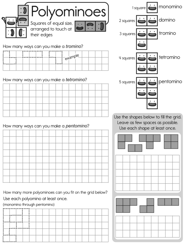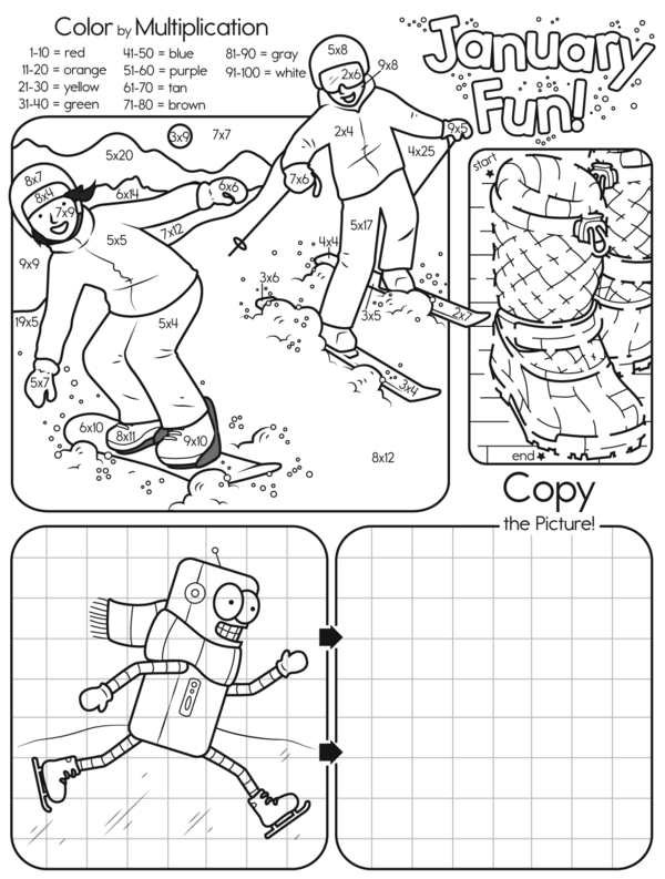 Get ready for some fun math challenges! First, solve the addition and subtraction problems. If the answer is over 100, color the area white. If it's under 100, color it blue. Then, read the coordinates, plot the points, and connect the dots to reveal the picture. Next, on page 2, multiply your way through a color-by-number, navigate a snow boot maze, and draw a matching robot in skates. Finally, meet the members of the polyomino family! Use the quick guide to learn how to tell the shapes apart, then complete the activities. Enjoy the challenges!