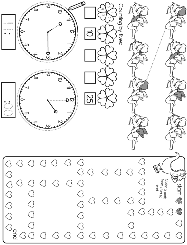 Puzzle time! First, can you help Candy, Mandy, and Andy get through this tricky maze filled with sparkler dead ends? Next, get ready to add, round, and fill in missing numbers. Then, on page 3, solve some word puzzles and number puzzles. Finally, match the Cupids, skip count by 5, check the clocks for the times, and color a path from start to end!