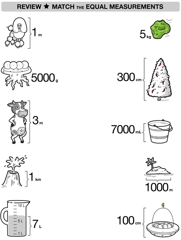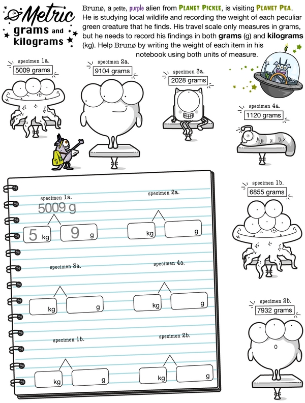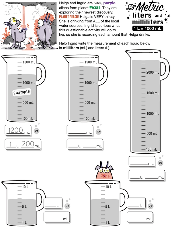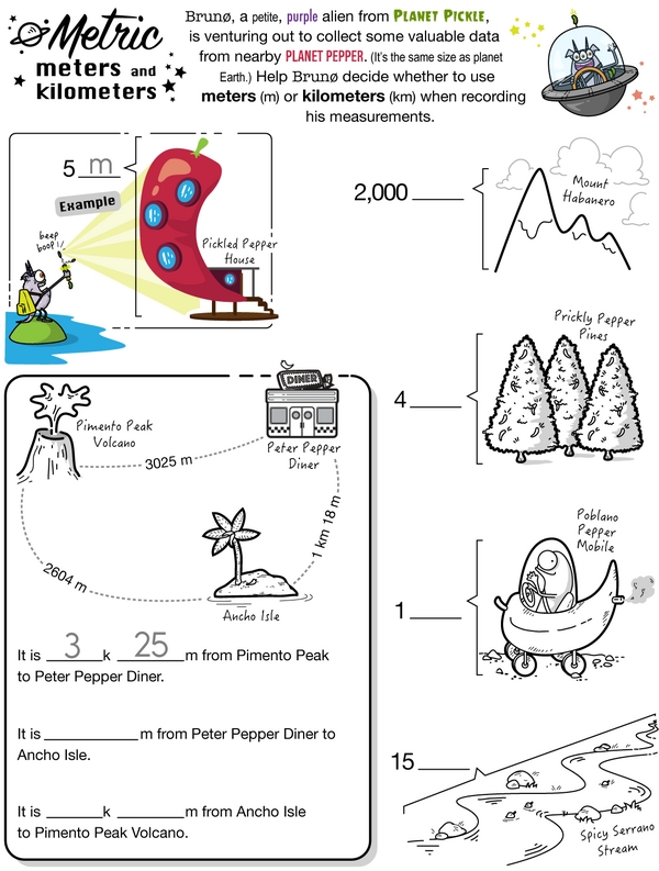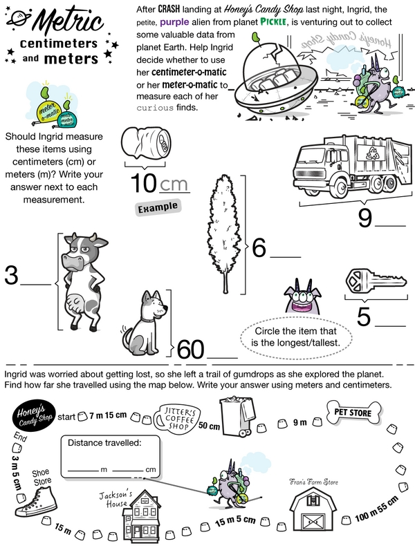 Get ready to join these purple aliens from Planet Pickle on a measuring expedition! Along the way, they'll discover candies, collect intel, and get very thirsty at Planet Peach. They're using the metric system to record everything. How long or tall are the objects? How far do they travel? How heavy are the peculiar creatures from Planet Pea? And how much liquid does Helga drink? Read the clues and solve them all!
