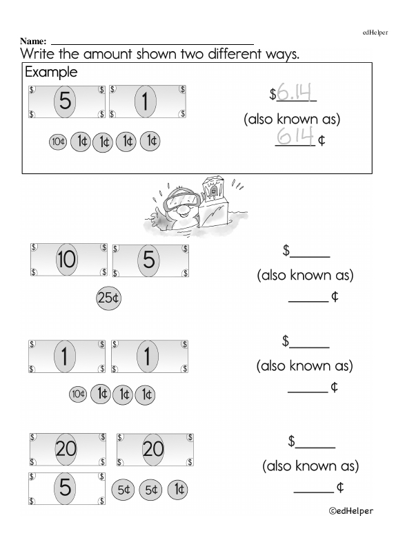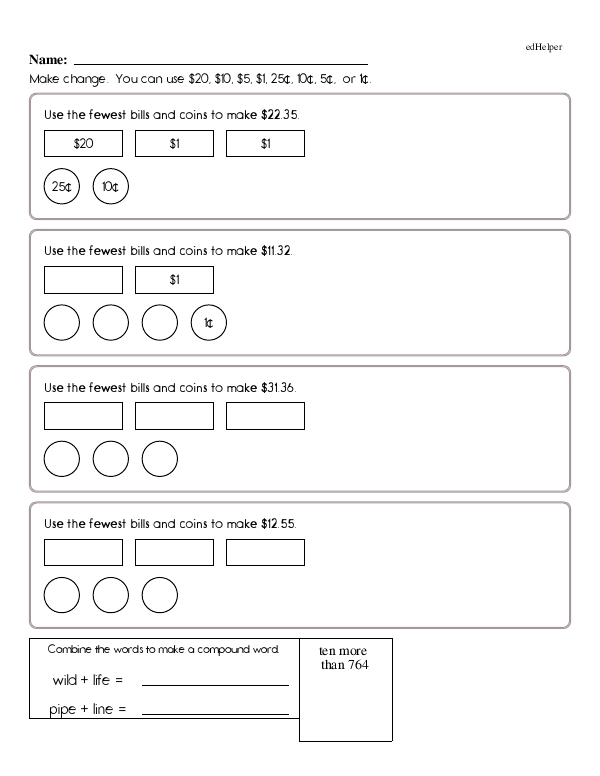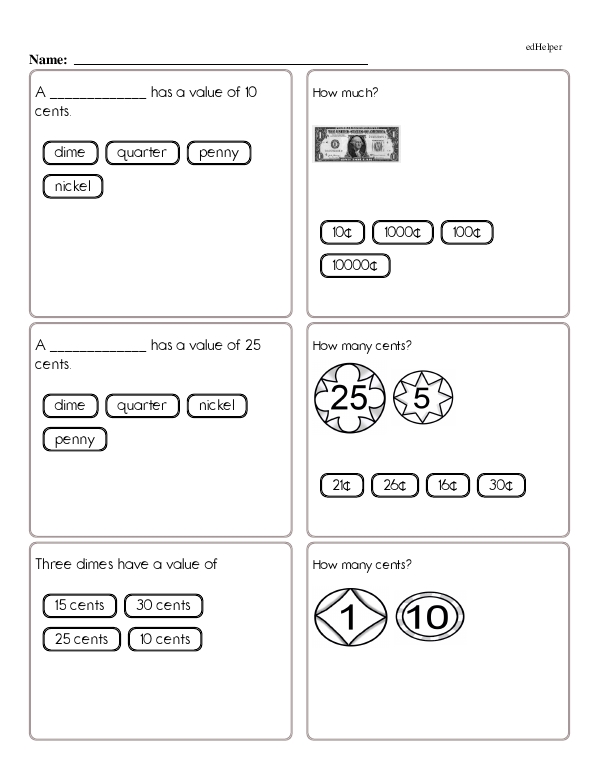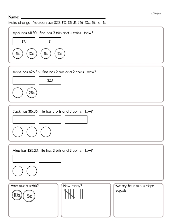 For example, a problem might present a series of coins, such as 3 dimes, 2 nickels, and 4 pennies, and ask students to calculate the total amount. Another problem could involve buying an item that costs 75 cents with a dollar bill and asking how much change should be received. Such exercises help students become familiar with coin recognition, addition, and subtraction.
