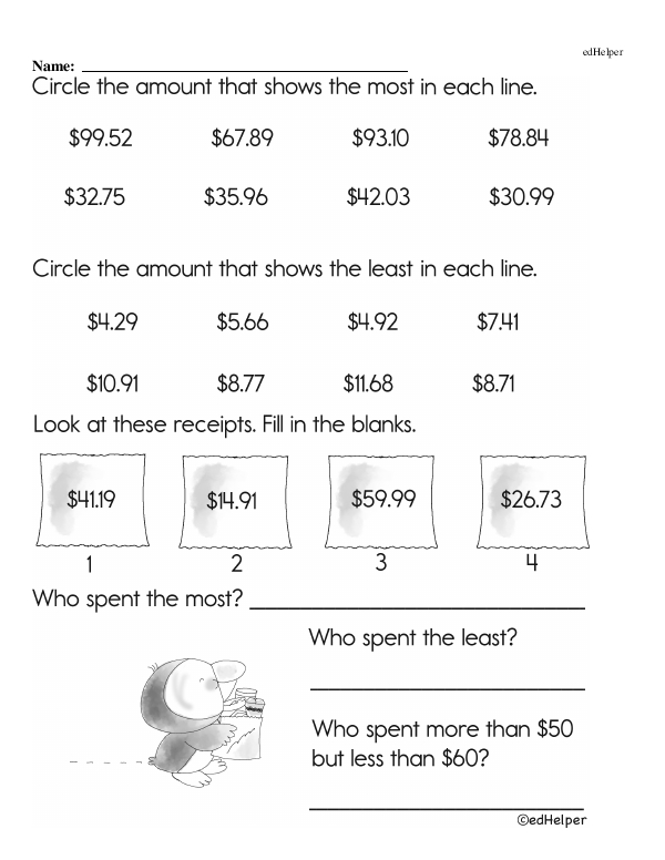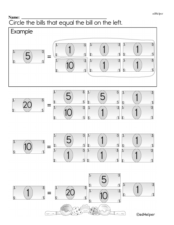 This math chapter workbook on "Money" focuses on recognizing and identifying various coins and bills and associating them with their values. Students will practice counting money by combining different denominations and making change from simple transactions.