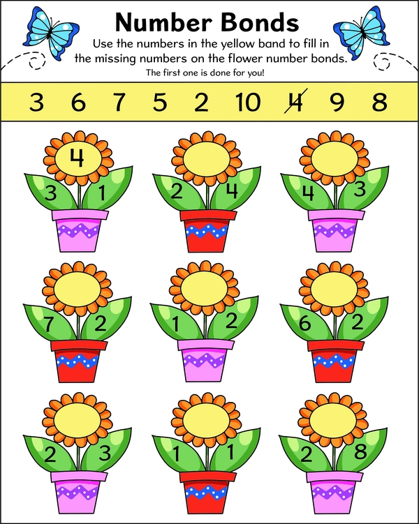 Let's add with number bonds! Look at the two numbers on each flower's leaves. What do they add up to? Find the right total and write it on the flower.