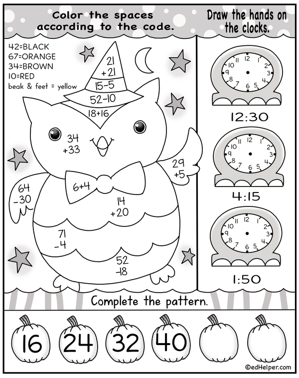 Let's solve some spooky puzzles! In this workbook, you'll add, spot the mismatch, compare numbers, finish a color-by-number, draw clock hands, and complete a number pattern. Grab your pencil and crayons, and let's get started!