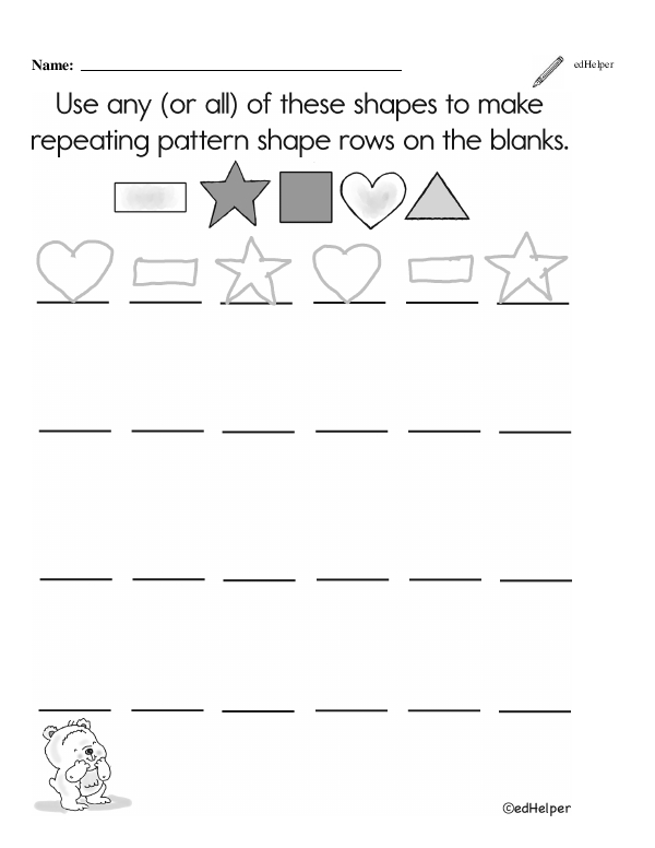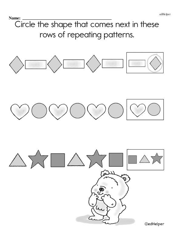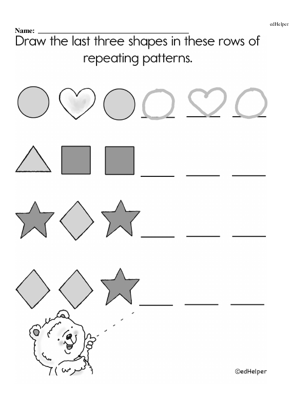 This math chapter workbook on "Patterns" includes recognizing and sequencing simple repeating patterns such as AB, AAB, ABB, and ABC using objects, shapes, colors, or numbers. The teacher should introduce the idea of a pattern unit, helping students understand how a segment of a pattern repeats. Engaging activities could involve using manipulatives like blocks, beads, or cut-out shapes to form patterns.