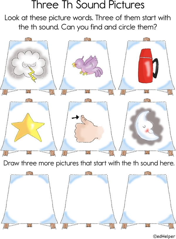 It's phonics time! Sound out each picture word. Find the three that start with the th sound and circle them. Then draw three more picture words that begin with the th sound.