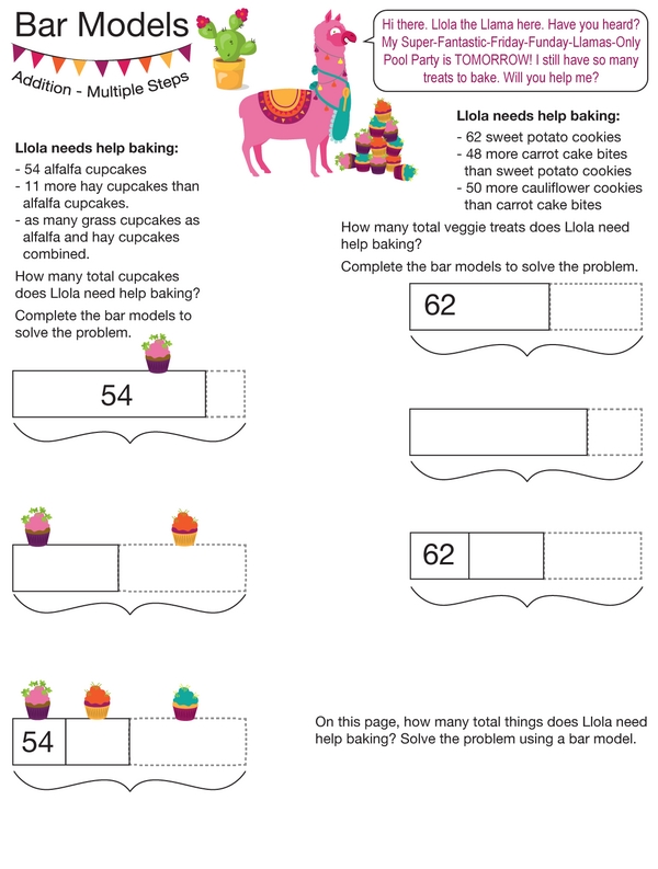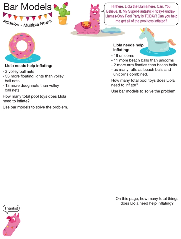 Party time! Use bar models to help Llola the Llama plan the greatest pool party ever! Balloons, beverages, tasty treats, and floats - lots to prepare! Read the clues and help her figure out how many items she needs.
