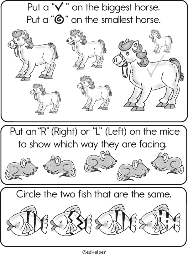 Let's do some position, direction, and size activities! On page 1, where is the cow to the star? Read the clue and circle the correct picture. Next, these six horses are different in size. Follow the directions to find the right horses. Then, write which way the mice are facing and find the matching pair of fish. Finally, on page 3, look at the line-up and write the bird's position.