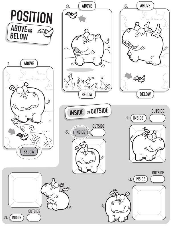 Big, small, above, and below, critters in this workbook will show us all that and more! On page 1, look at these animals. Who's big? Who's small? And who has the same size? Then, on page 2, check out the positions of the bird and the pool to the little hippo and circle the correct answers.