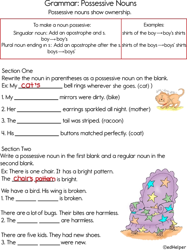 Ready to stake a claim? Use a possessive noun! Here are some common grammar rules to show ownership. For a singular noun, add an apostrophe and s, like boy's. For a plural noun ending in s, add an apostrophe, like boys'. For a plural noun not ending in s, add an apostrophe and s, like children's. Today, you'll practice the first two rules. Follow the directions and complete the activity.