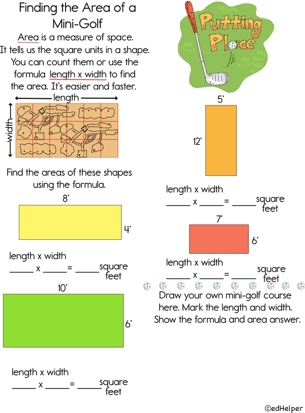 Area is the space inside a flat shape. To find the area of a rectangle, simply multiply its length by its width. Ready to try this formula? Look at these 4 mini golf courses. What are their lengths, widths, and areas? Before turning in your worksheet, draw a rectangular mini-golf course. Mark its measurements and use the formula to find its area.