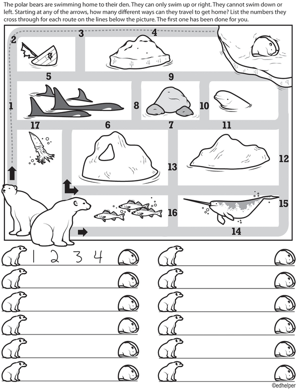 Brain teaser time! On page 1, you're shopping for the Chinese New Year. Check the price tags, count the coins, and answer the questions. On page 2, help the polar bears map out twelve ways to swim home to their den. Remember, they cannot swim down or left. All done? Great job!