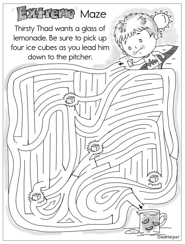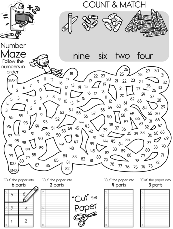 Ready to solve some fun puzzles? Great! Let's dive in. On page 1, fill in the blanks as you subtract, skip-count by 10, and figure out what number comes next. Then, help Thirsty Thad pick up four ice cubes to add to the lemonade pitcher. Finally, on page 3, count the school supplies, work through a number maze, and draw lines to split the pictures into equal parts.