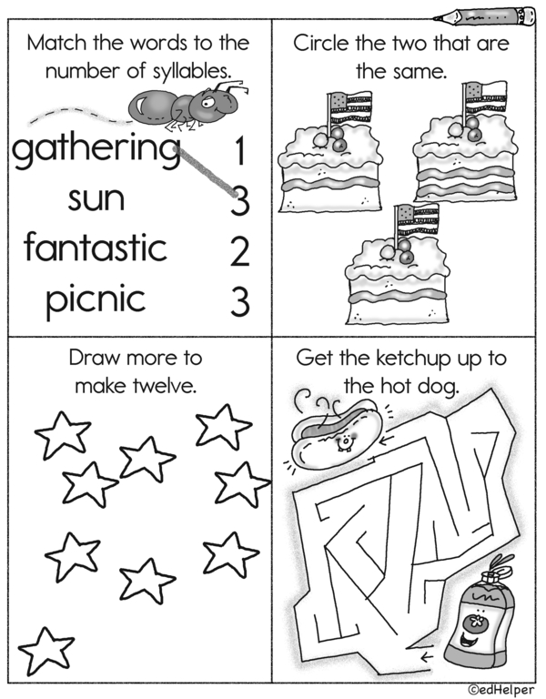 Welcome to Puzzle Zone! First, solve addition problems with color, circle the numbers in their teens, and find the unicorn with its matching clover. Then, count the syllables, circle the two cakes that look the same, draw more stars to make 12, and help the ketchup reunite with the hotdog!