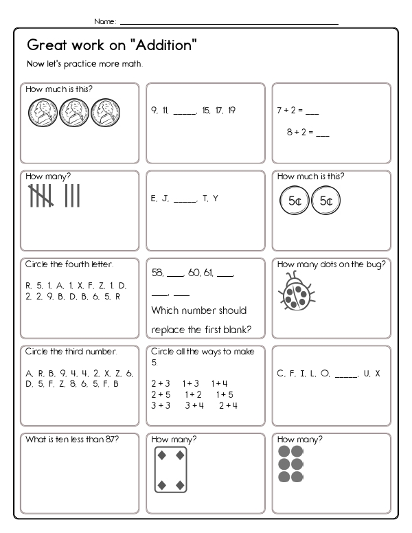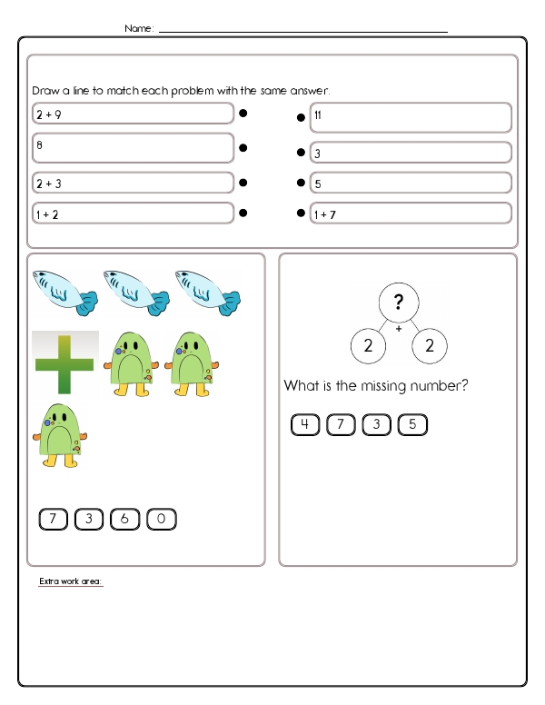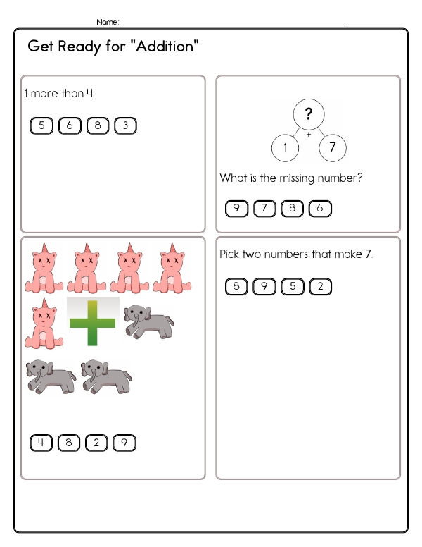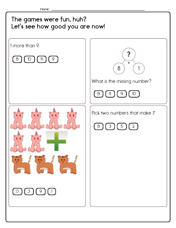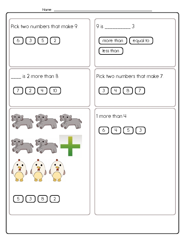 Now that kids have mastered the numbers to ten and how to count, it is an excellent opportunity to introduce some simple addition. This assessment lets kids practice adding one and adding two with easy-to-follow problems. This unit offers a mix of number sense activities focused on adding small numbers within ten. Students solve one more and two more questions to practice counting on. They complete number bonds by finding missing addends. Problems ask learners to count animals, then choose the matching total. Comparison items require choosing words like more than, less than, or equal to when looking at two numbers. Common Core skills are 1.OA.1 1.OA.3 1.OA.4 1.OA.6 and 1.NBT.3.
