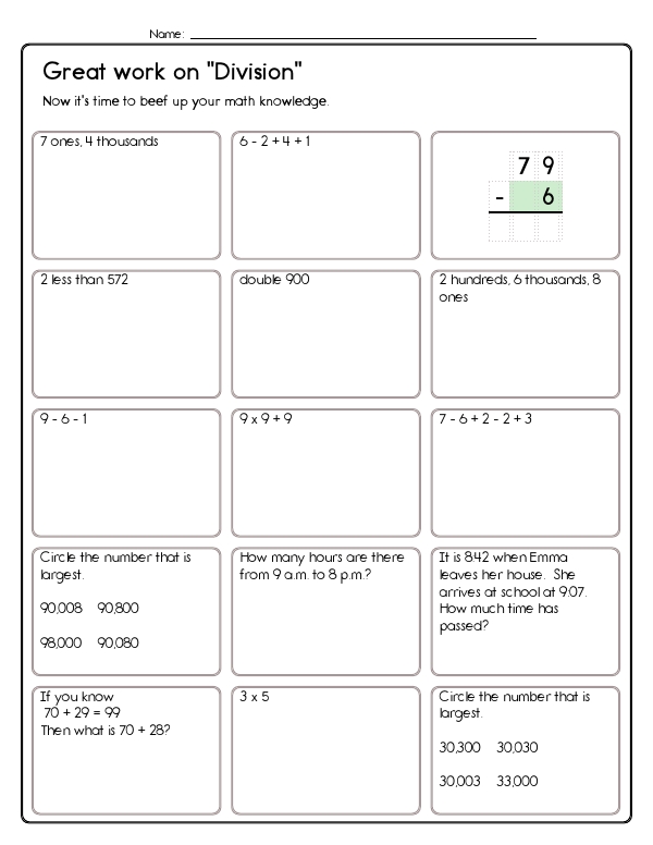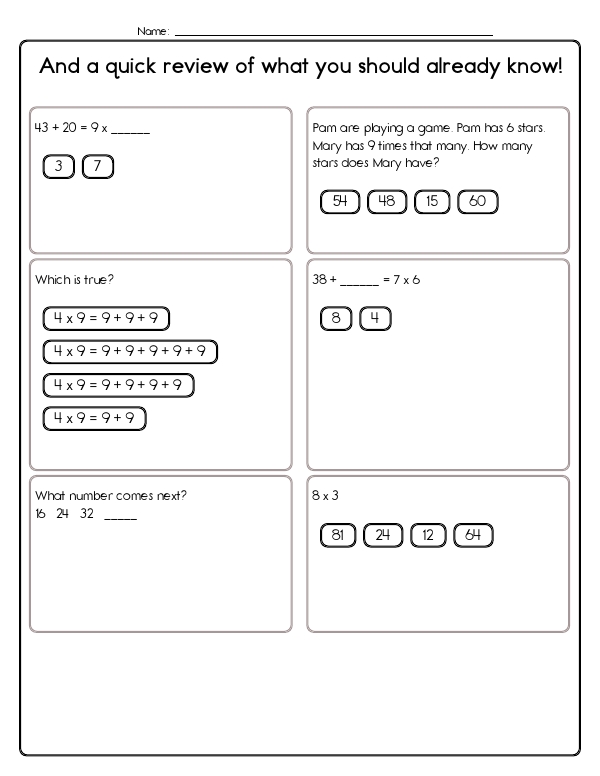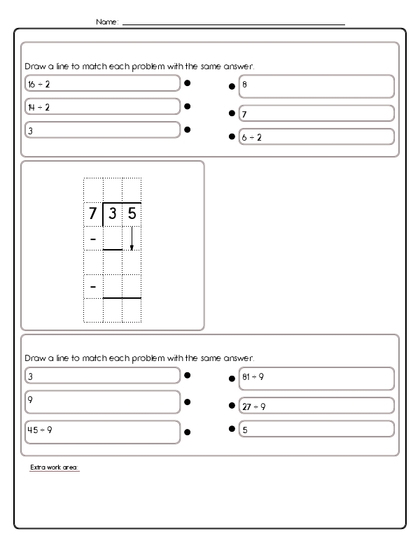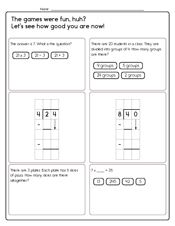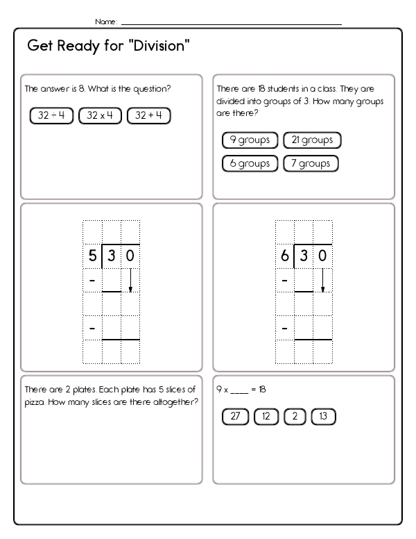 This math assessment workbook introduces students to the fundamentals of division. Students will practice seeing division as equal grouping (e.g., 28 students split into groups of 4), relate it to repeated subtraction and multiplication (fill-in-the-blank 9 x ___ = 36), and solve simple story problems such as sharing pizza slices. Exercises strengthen fact fluency and help children recognize the inverse relationship between multiplication and division. Altogether, the pages develop number-sense, fact recall, operation selection, and problem-solving confidence in preparation for more advanced division work.