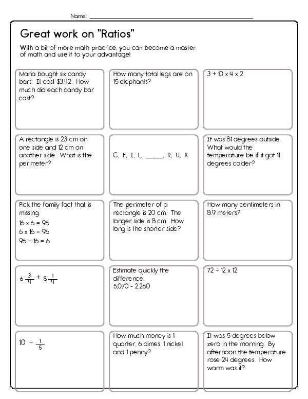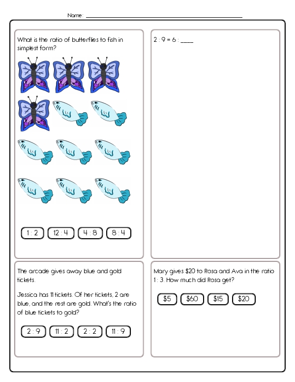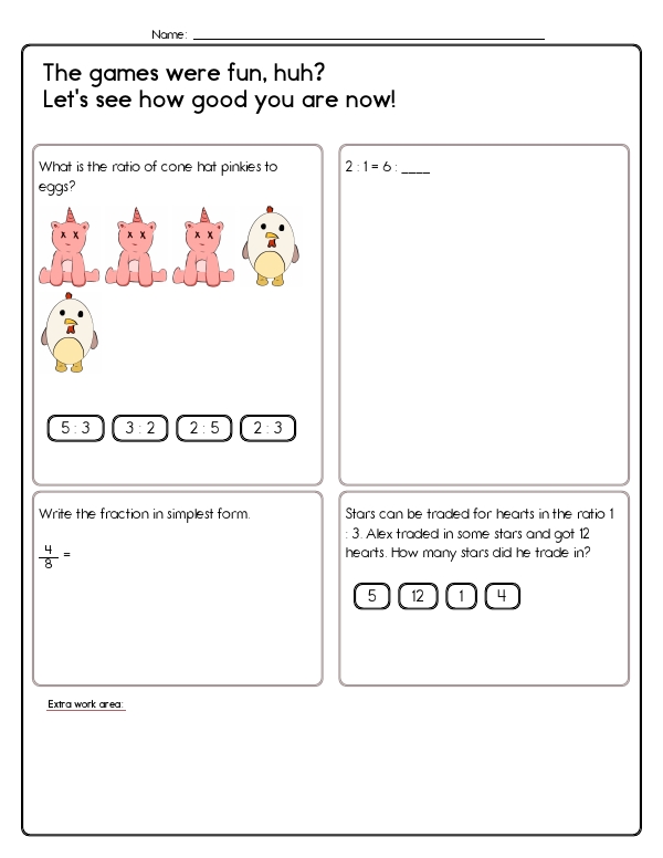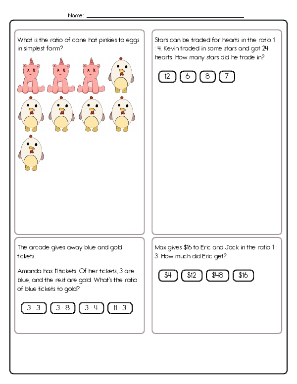 This math assessment workbook features problems designed to help students understand and work with ratios and equivalent fractions. Students are tasked with identifying and comparing ratios in both numerical and pictorial representations. They are also required to solve problems that involve finding the missing term in equivalent ratios. Additionally, the unit includes word problems that require students to apply their understanding of ratios to real-life scenarios. The common core skills for this unit are primarily focused on understanding and working with fractions and ratios, as well as developing problem-solving skills related to proportional reasoning.