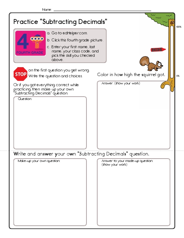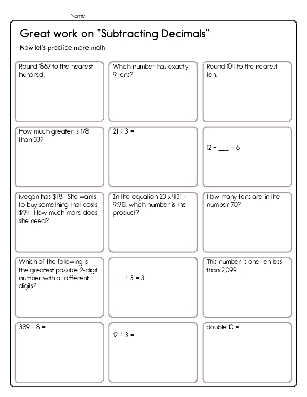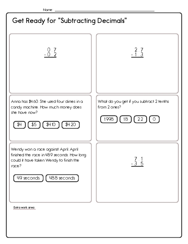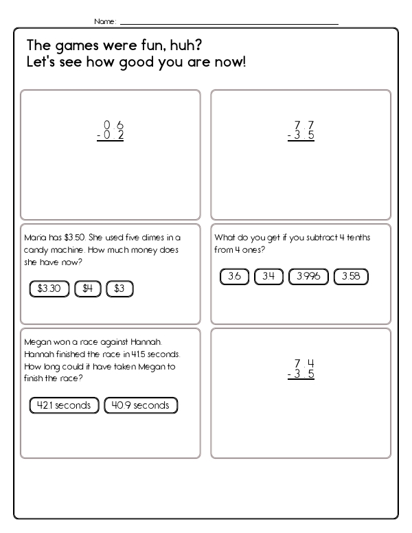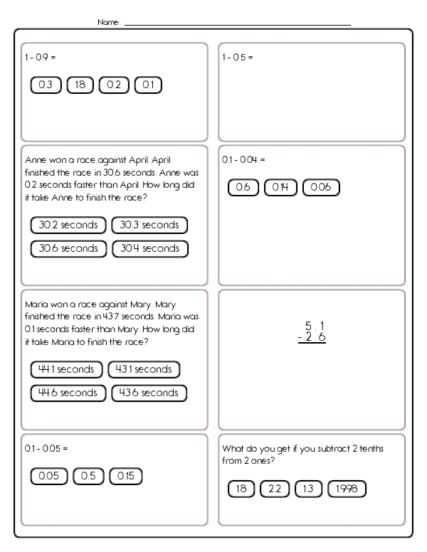 This math assessment workbook provides students with extensive practice in subtracting decimals. They will practice solving straightforward vertical subtraction problems, such as 5.7 minus 1.3 and 0.7 minus 0.4. They also tackle money questions where a fixed cost in dimes is taken from a dollar amount. Word problems ask students to determine the faster time by subtracting tenths. Some items require students to translate language like "two tenths" or "four tenths" into decimal numerals before subtracting from whole numbers. Students will also practice taking a horizontal problem, such as "1 minus 0.1," and figure out how to solve it by setting it up vertically.