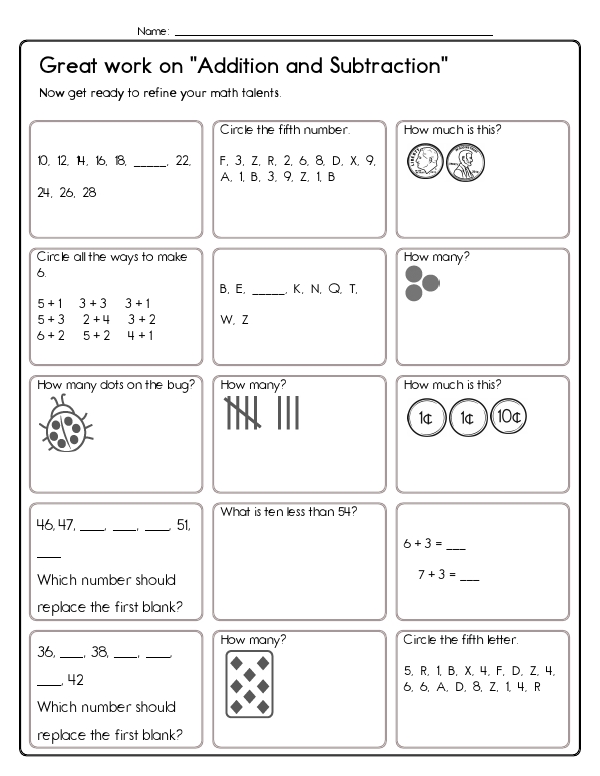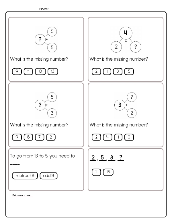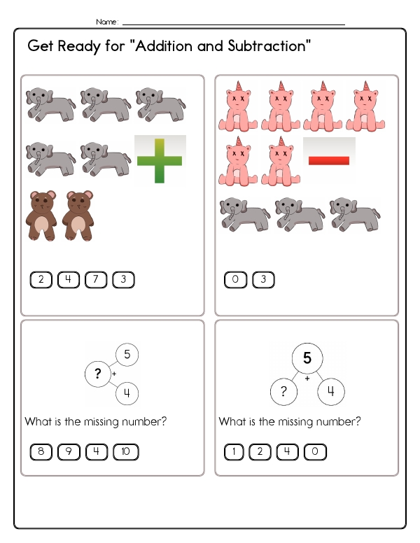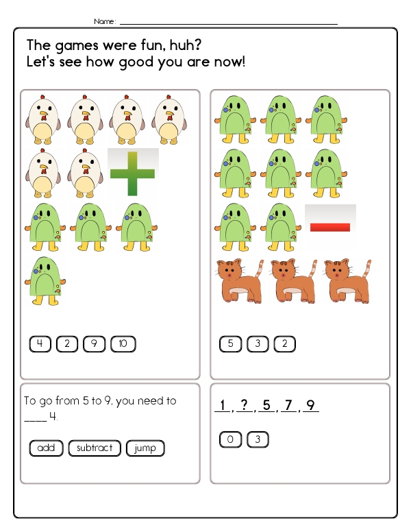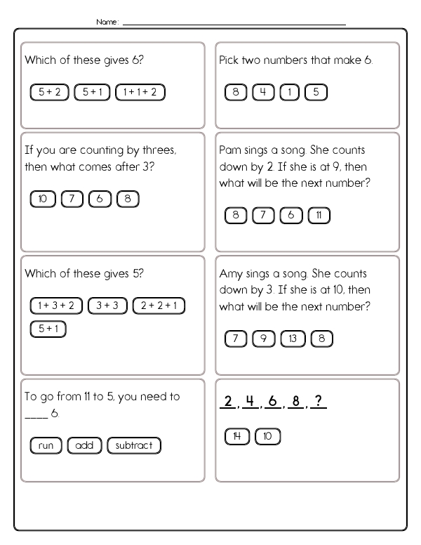 In this Grade 1 math assessment unit, students encounter a variety of problems with numbers zero to ten, focusing on basic arithmetic operations. Along with counting and subtracting smaller numbers, students will encounter pattern recognition and simple number bond problems. These exercises emphasize counting and visual representation through images, requiring students to add or subtract by counting animals or objects. Students also solve missing number problems in equations and determine what numbers can be combined to create a specific sum. Many problems involve selecting the correct operation to reach a given number. In addition, the unit addresses counting in sequences, such as by twos or threes, and providing the next number in the sequence. The common core skills focused on in this unit include developing an understanding of addition, subtraction, number sense, and recognizing patterns.