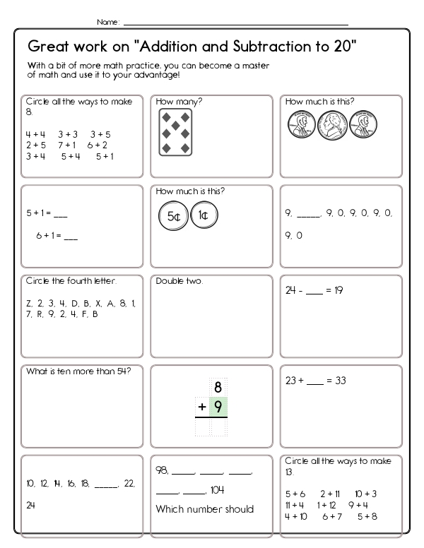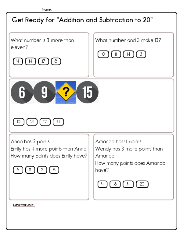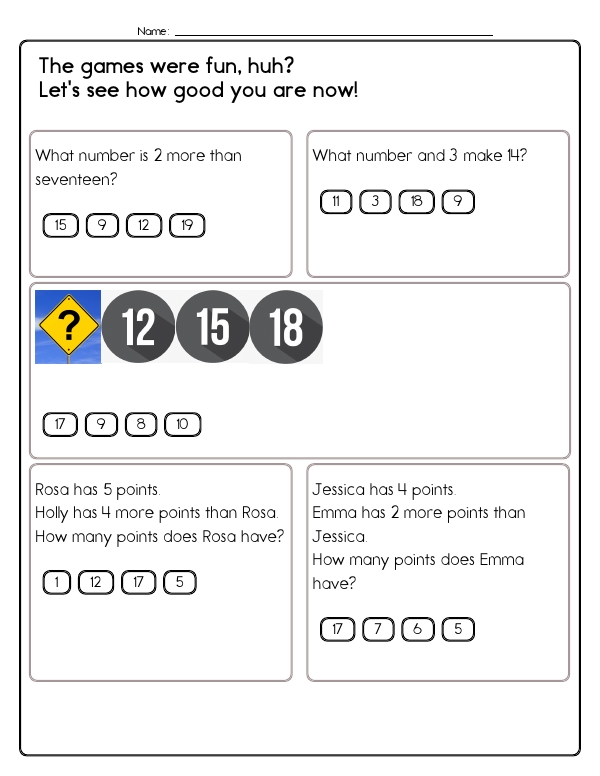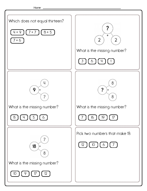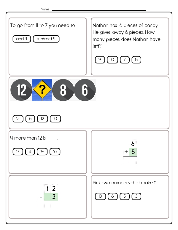 This math assessment workbook consists of engaging, colorful pages designed to help second graders practice addition and subtraction up to 20. Practice pages contain various math problems prompting students to solve addition and subtraction-related questions. Problems include filling in missing numbers, multiple-choice questions, and selecting numbers to complete sums. Students solve single-step word problems, complete missing-addend and missing-subtrahend equations, identify numbers that make a given total, and fill in part-part-whole number-bond diagrams.