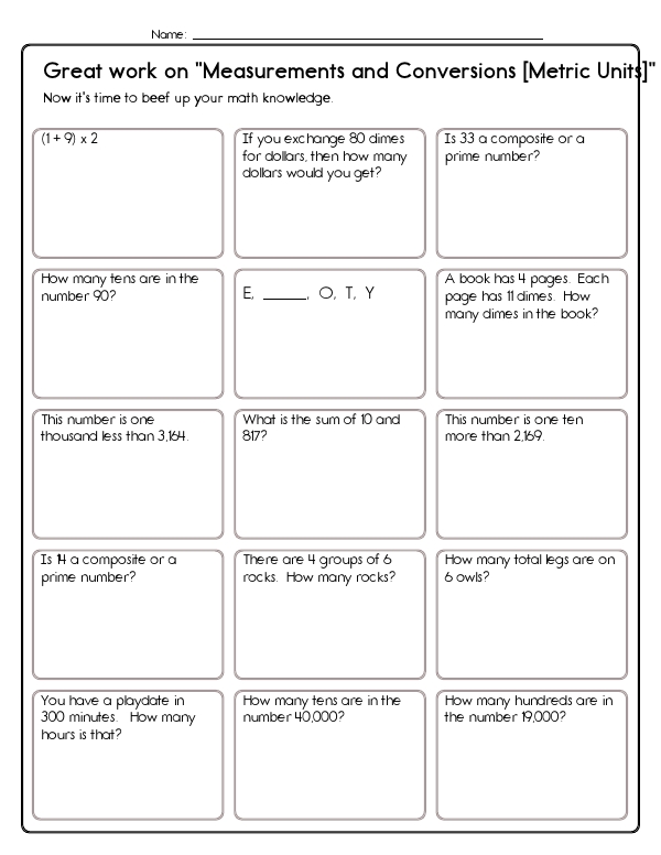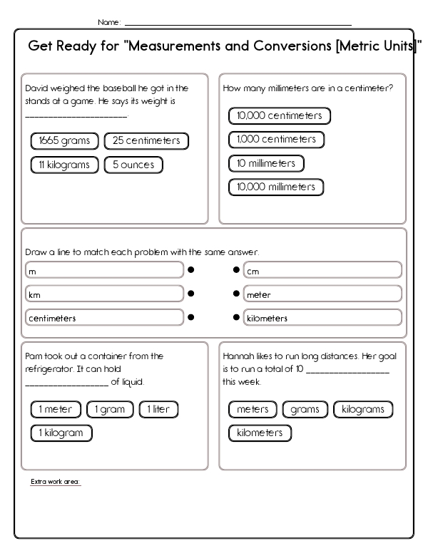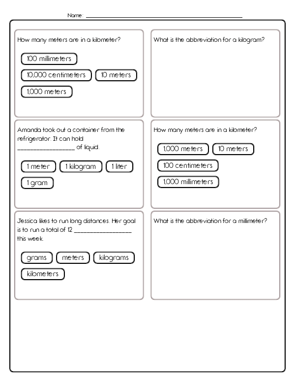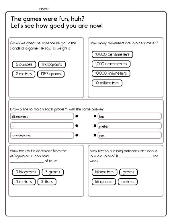 This math assessment workbook helps students master metric measurements. It guides students from millimeters to kilometers, and challenges them to weigh, measure, and convert between metric units. It presents real-world scenarios, from weighing baseballs and soccer balls to exploring liquid capacities and running distances. Engaging multiple-choice items and matching exercises helps children differentiate between customary and metric units of length, mass, and capacity. Learners practice identifying reasonable unit choices, such as ounces for a baseball or liters for a drink. Problems also challenge kids to determine how many smaller units fit into a larger unit, such as 100 centimeters in a meter. Real-life contexts, such as weighing sports equipment or planning a running distance, help learners connect the numbers to familiar situations. Common Core skills targeted are understanding relative sizes of measurement units within one system and solving word problems by converting units.