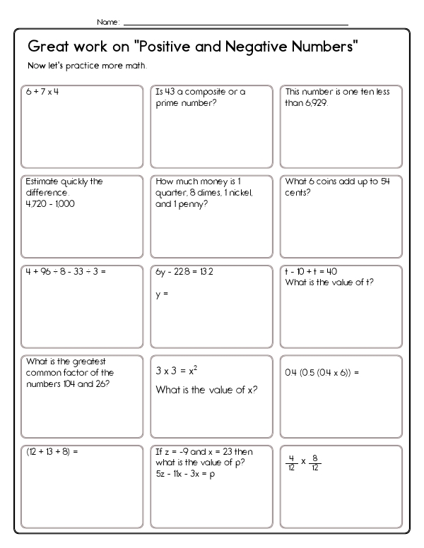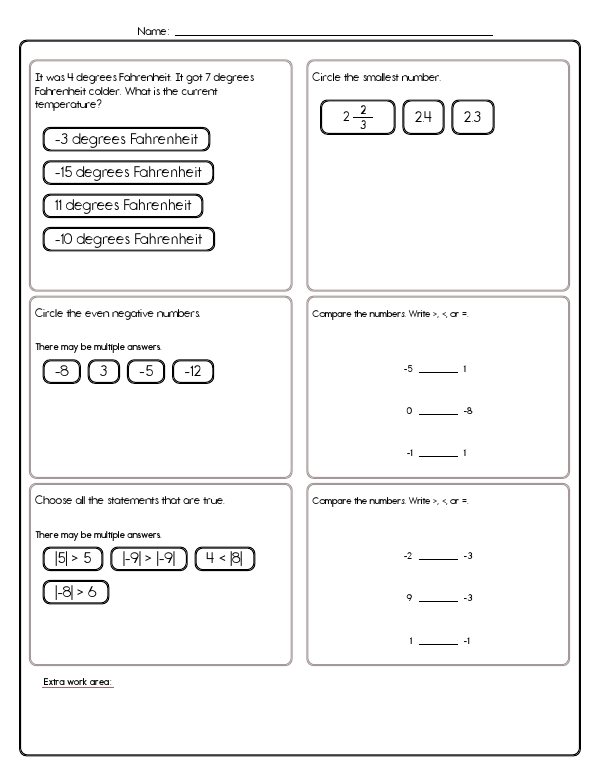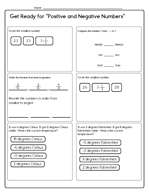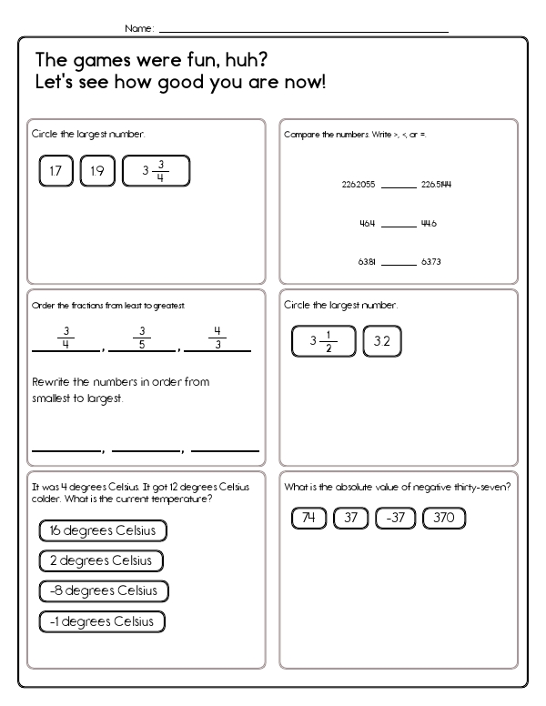 This math assessment workbook focuses on testing kids' understanding of integers and their knowledge of positive and negative numbers. It covers a range of problems involving comparing and ordering numbers, understanding fractions and decimals, determining temperature changes, and recognizing odd or even negative numbers. Students are asked to select the largest numbers from given sets, compare pairs of numbers, and correctly order fractions. The unit also includes problems where students must calculate the new temperature after a given decrease and interpret the absolute value of numbers. The common core skills demonstrated in this unit include number sense, absolute values, and understanding positive and negative numbers.