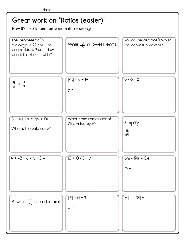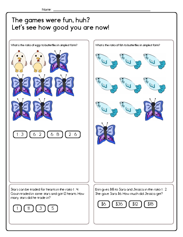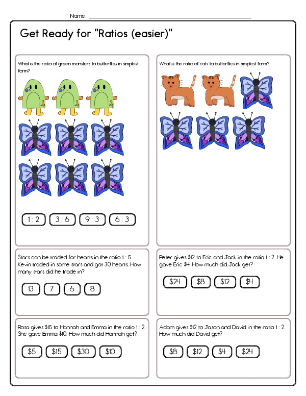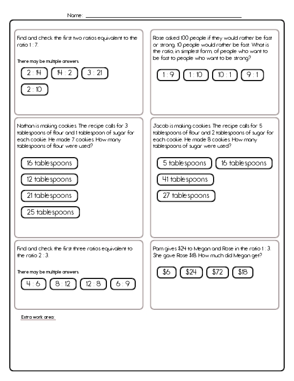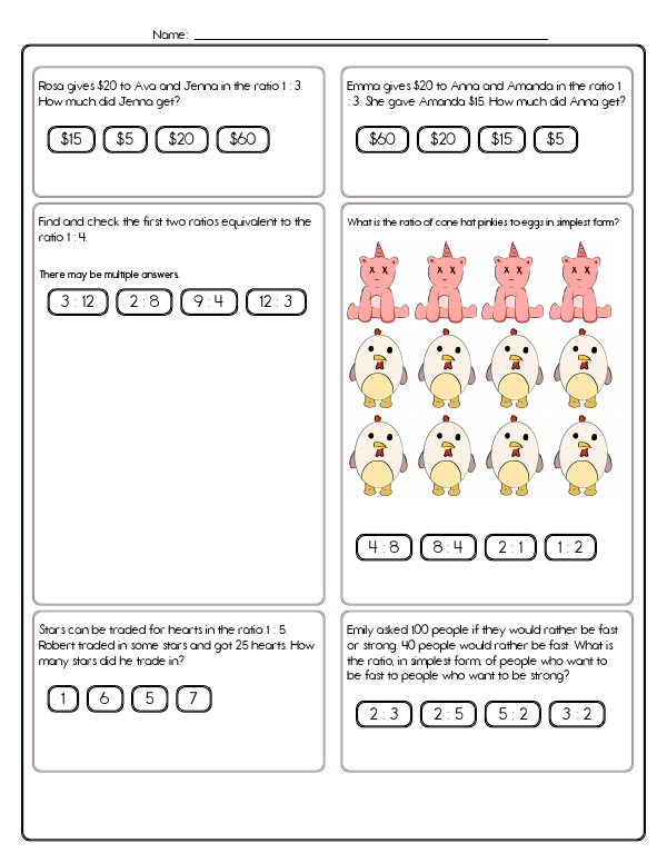 This math assessment workbook focuses on understanding and working with ratios and proportions. The problems include tasks such as identifying ratios from image groups, solving story problems involving ratios, and finding equivalent ratios. The unit helps students build their skills in reasoning and problem-solving using ratios. The common core skills for this unit include understanding ratios and proportional relationships, solving real-world and mathematical problems involving ratios and rates, and reasoning quantitatively.