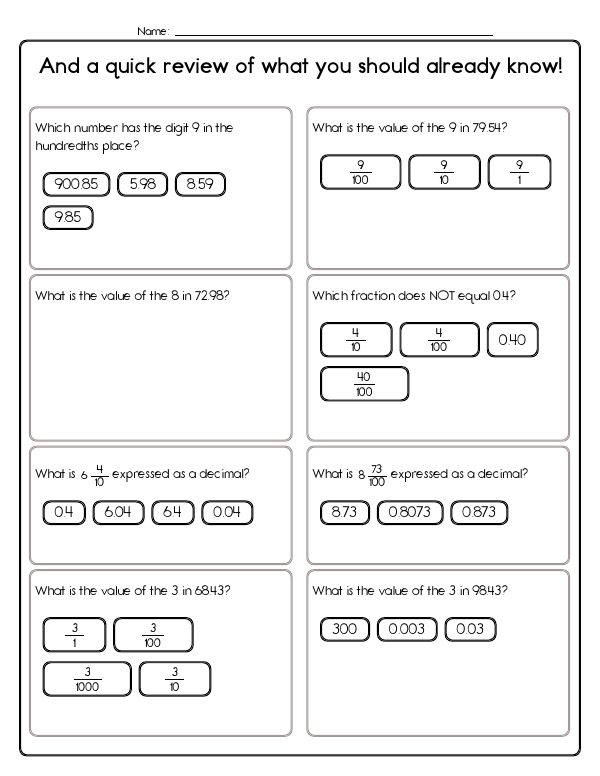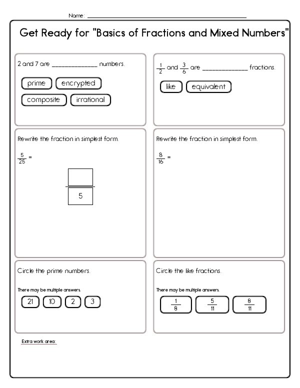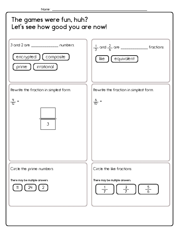 In this math assessment workbook, students are tasked with identifying prime and composite numbers, finding equivalent and like fractions, simplifying fractions, and converting simple fractions to their decimal equivalents. The unit emphasizes understanding the characteristics of different numbers and fractions, as well as performing basic operations with fractions and conversions. The common core skills covered in this unit include understanding and applying knowledge of prime and composite numbers, equivalent fractions, fraction simplification, fraction-decimal conversions, and identifying relationships between fractions.