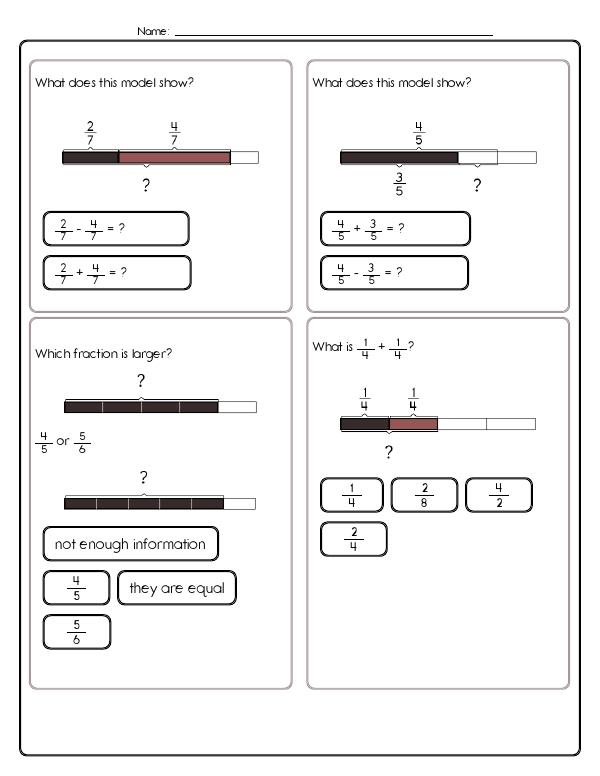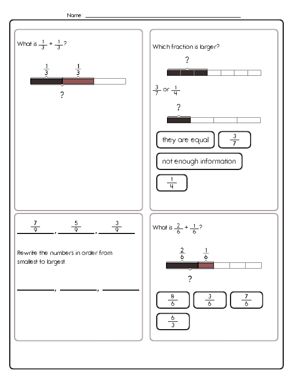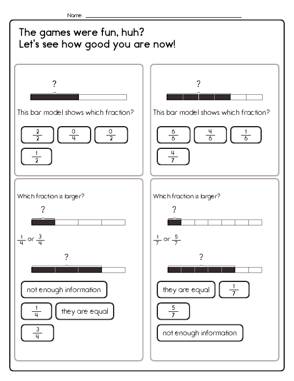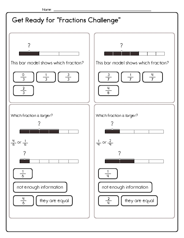 This math assessment workbook uses bar models to help students solidify fraction concepts. Across the pages, children practice identifying the fraction a model represents, comparing which of two fractions is larger, ordering several fractions from least to greatest, and determining the missing part needed to make one whole. Kids will also be adding and subtracting fractions that share a common denominator. Coloring tasks reinforce the idea of a fraction as "part of a whole."