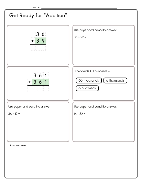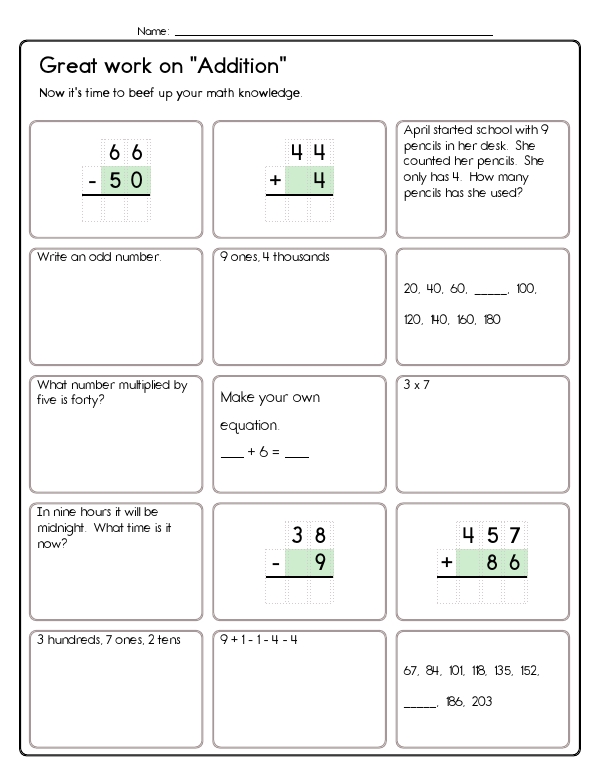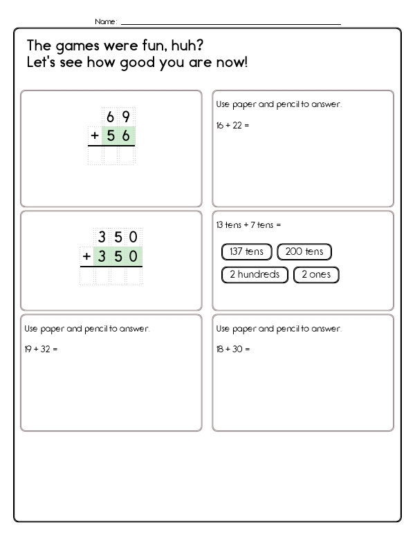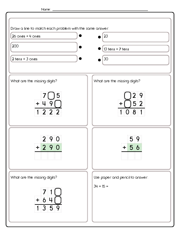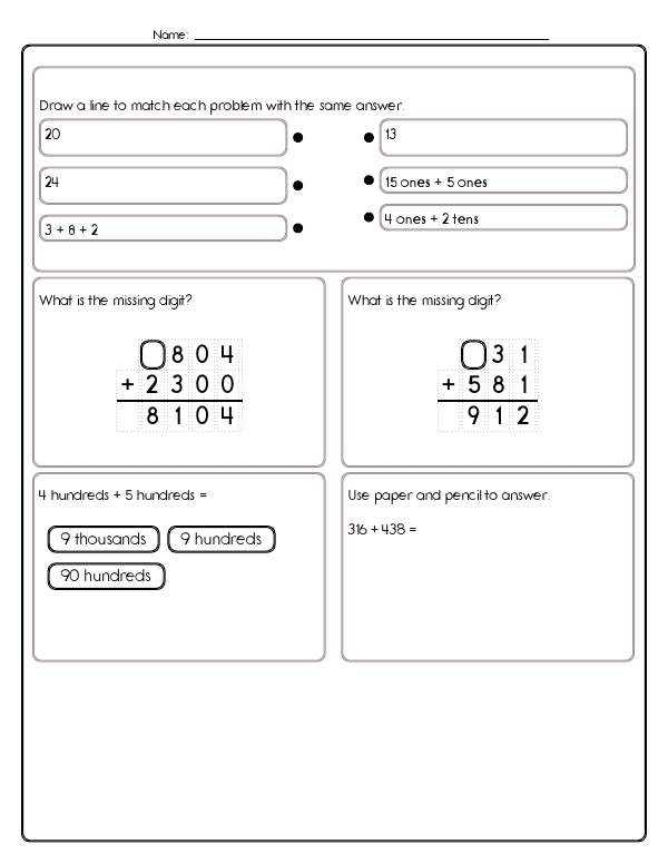 This math assessment workbook provides students with practice in adding small numbers mentally, selecting appropriate math vocabulary (sum, difference, estimate), and applying place-value understanding to round two- and three-digit numbers to the nearest ten or hundred. Each problem asks children to perform single-step or short multi-step calculations (e.g., "round 572 to the nearest ten, then add 20") and to pick reasonable estimates. This workbook is bursting with a mix of vertical problems, tantalizing missing digits, and easy-to-follow addition equations.