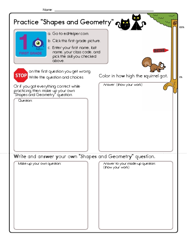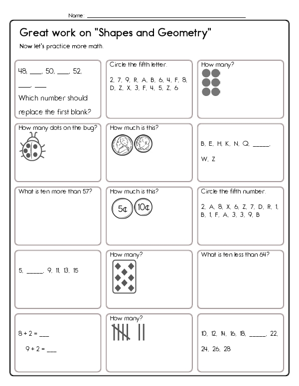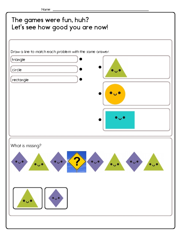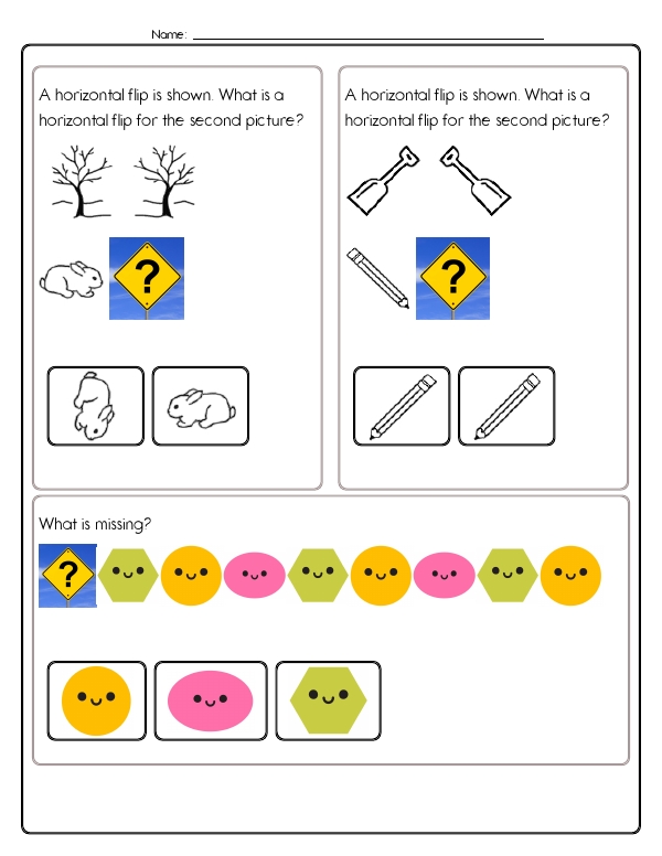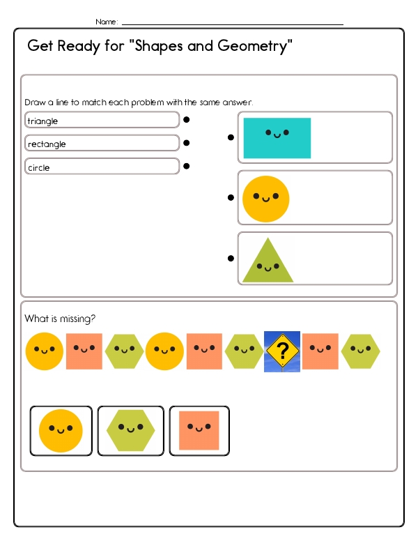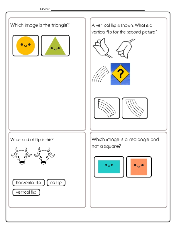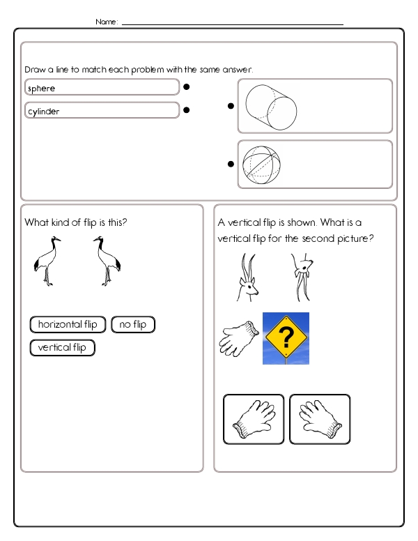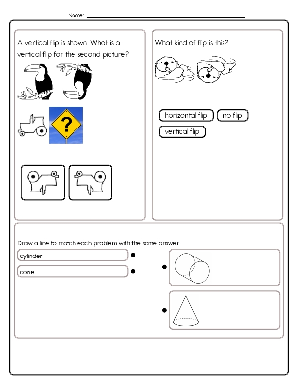 This first-grade math assessment workbook opens with a playful pre-assessment that asks children to match shape names to pictures and fill in missing pieces of simple AB patterns. Young learners explore a variety of geometric shapes, such as circles, squares, triangles, and those more complex, like cones and cylinders. The workbook helps students practice key geometry standards: identifying and naming familiar 2-D figures (circle, square, rectangle, triangle, pentagon), recognizing basic 3-D solids (cube, sphere, cone), completing and extending shape patterns, and understanding simple transformations by choosing or labeling horizontal and vertical flips. The unit reinforces CCSS 1.G.A.1 and 1.G.A.2 as students identify, describe, and compare two and three-dimensional shapes, compose and decompose figures, and reason about flips, slides, and turns.