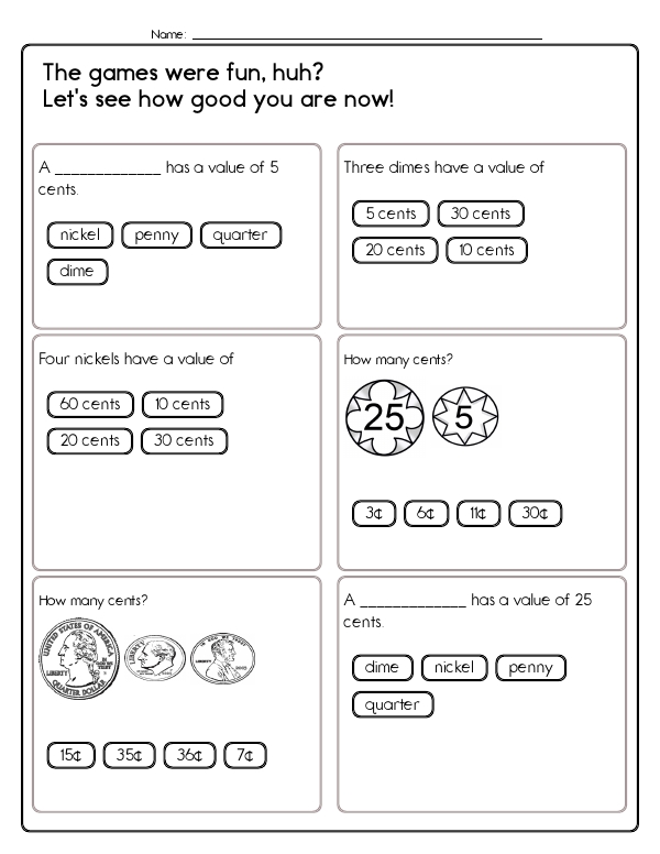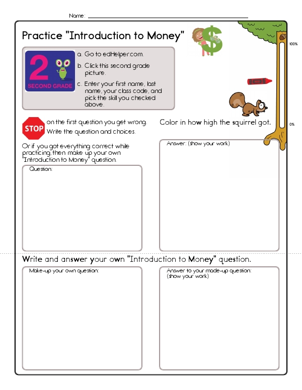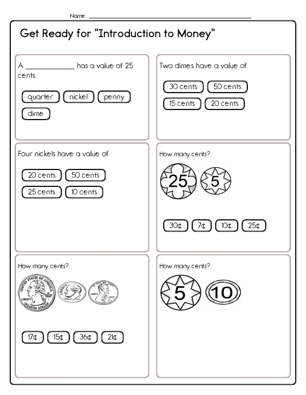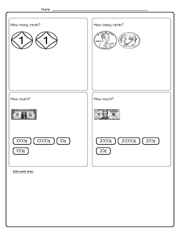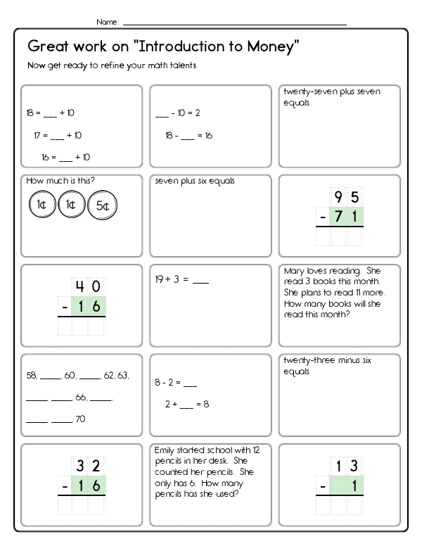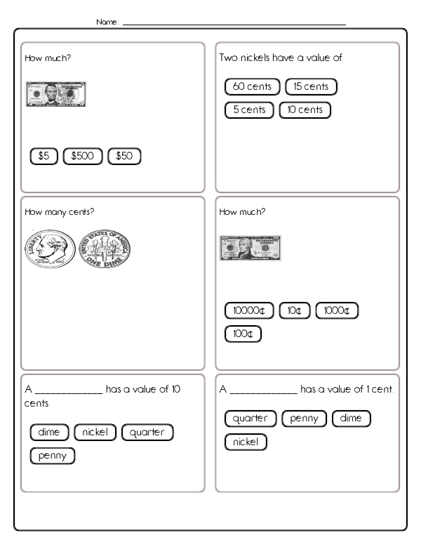 This math assessment workbook gives children practice with money. They will need to recognize U.S. coins and bills, know the value of each coin, skip-count by 1s, 5s, 10s, and 25s, and add mixed sets of coins to find total amounts expressed in cents or dollars. This workbook focuses on developing fundamental common core skills related to money management by engaging kids in recognizing and understanding the values of different coins and bills. It enhances their arithmetic skills through practical exercises in addition and subtraction involving coins and bills.