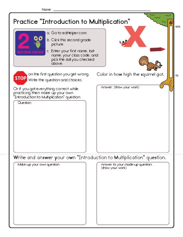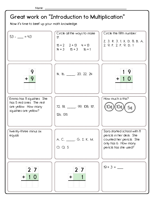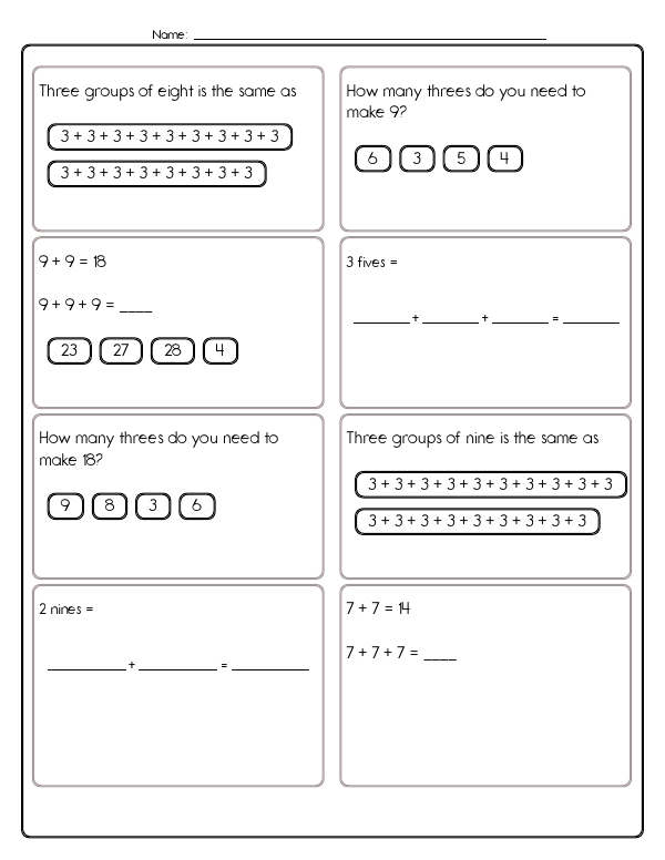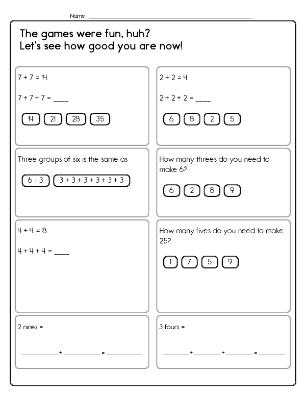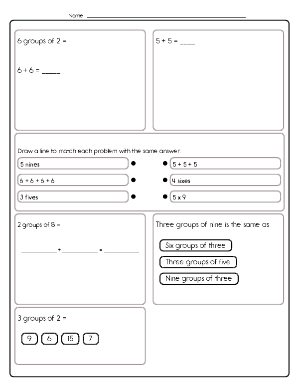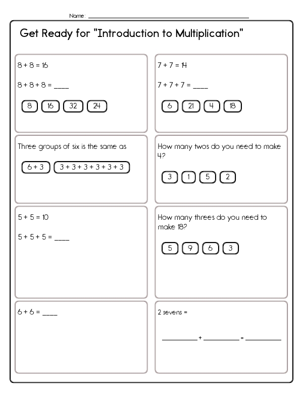 This math assessment unit helps students understand basic multiplication. It includes a variety of problems that focus on basic arithmetic operations, such as grouping and repeated addition. Students will work on calculating sums through simple arithmetic problems, such as "8 + 8 = 16". They will also explore the concept of equal groups and converting groups of a number into repeated addition. This "Introduction to Multiplication" workbook bridges the gap between addition and formal multiplication by presenting a lively mix of problems. Learners turn equal-group phrases ("three groups of eight"), pictures, or partial number sentences into repeated-addition expressions and then into totals.