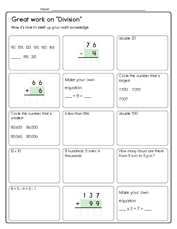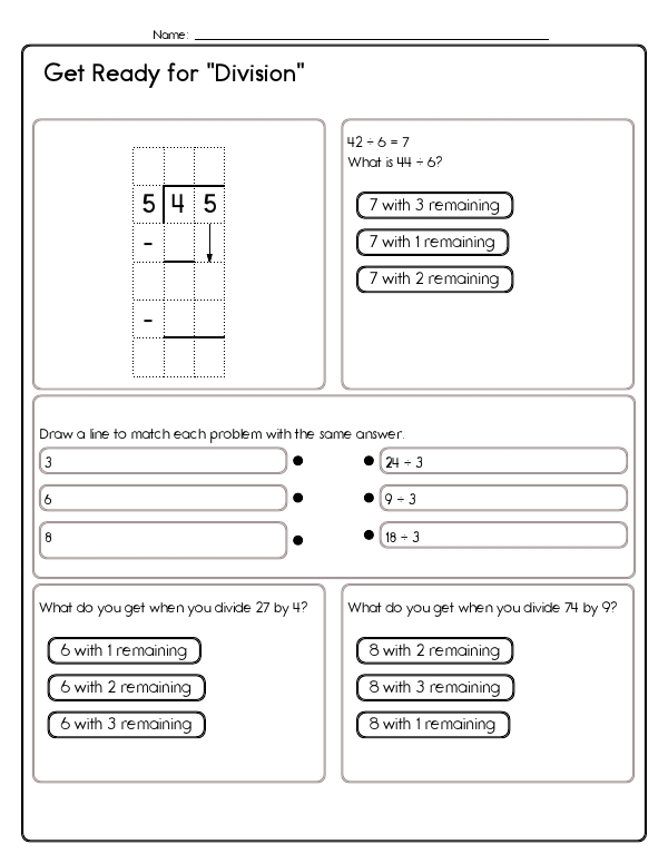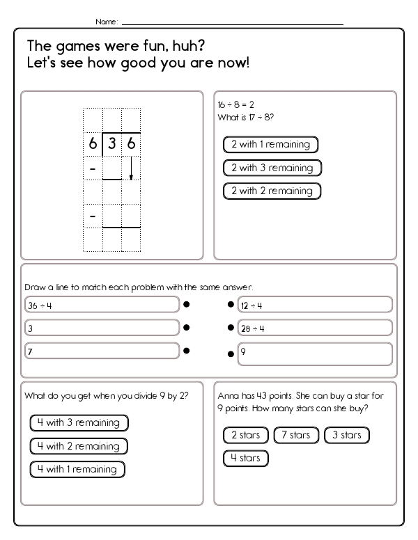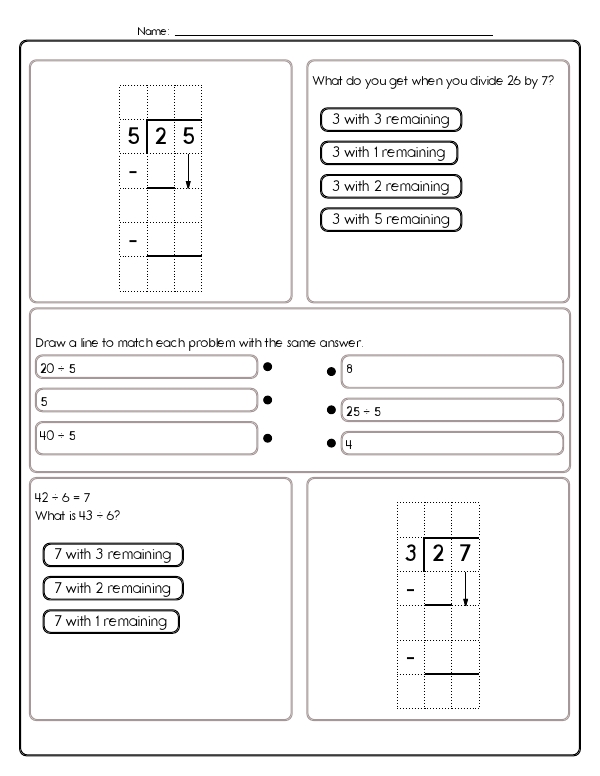 This math assessment workbook is designed to help students practice and enhance their division skills. The exercises focus on simple division problems, finding remainders, and solving word problems involving division. Across the activities, children partition sets into equal groups, solve single-digit divisor problems (some yielding remainders), use scaffolded long-division frames, and answer short word problems that connect division to real-life situations. Matching exercises reinforce the relationship between related equations, while multiple-choice items and step-by-step grid layouts guide learners through the division algorithm.