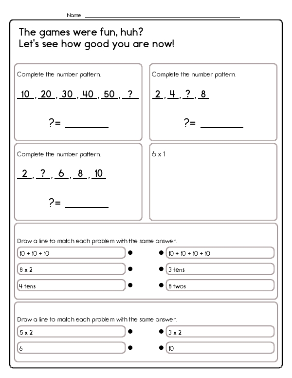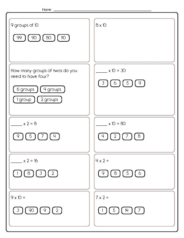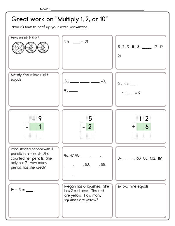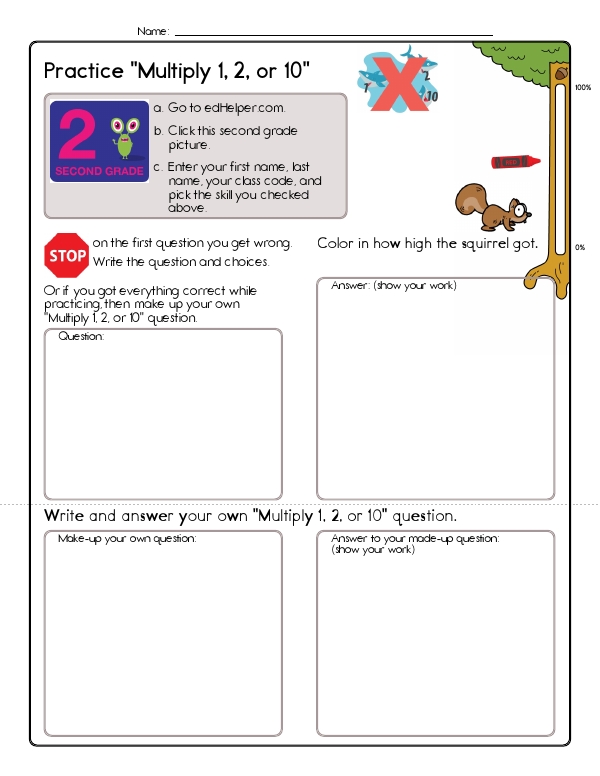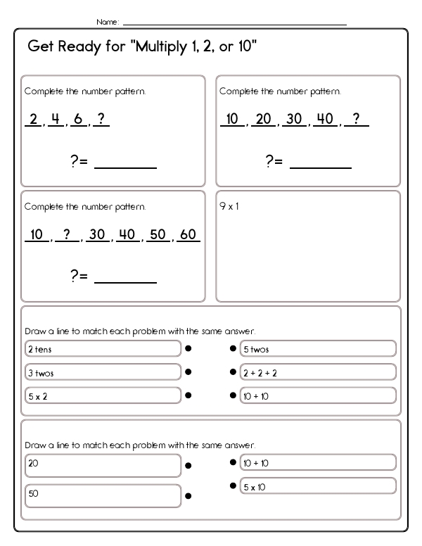 This math assessment workbook, "Multiply 1, 2, or 10," provides children with repeated and varied practice on the easiest multiplication facts. Students identify and extend skip-counting patterns by twos and tens, match equivalent representations of a product (repeated addition, equal groups, "tens" language, and standard multiplication notation), complete missing-factor equations, and choose correct answers from multiple-choice sets. This workbook helps students develop key math skills consistent with Common Core standards. It focuses on basic multiplication concepts and number patterns. Through exercises involving multiplying by 1, 2, and 10, students enhance their understanding of multiplication facts and will begin to feel comfortable with this new skill.