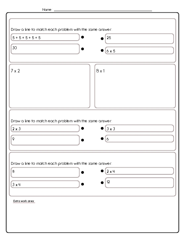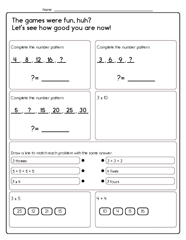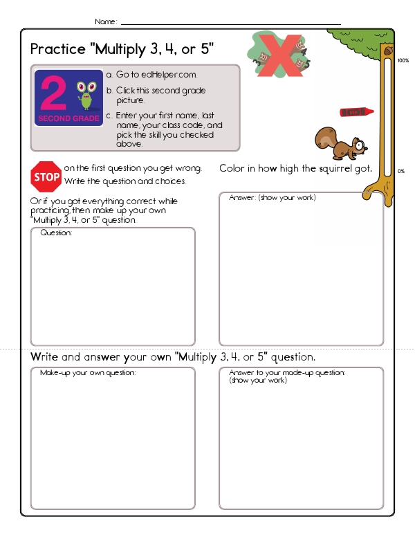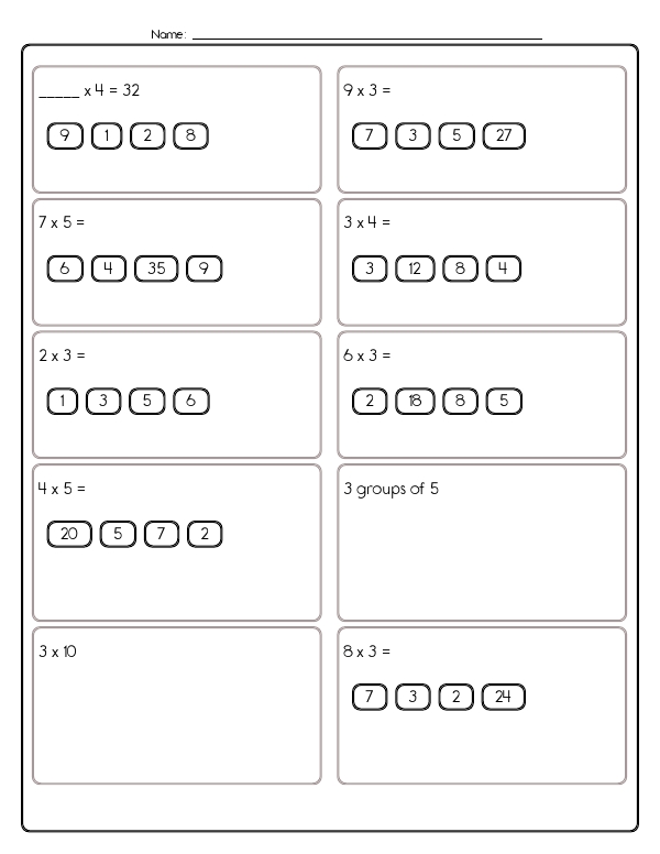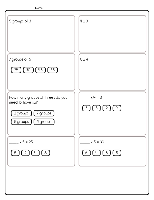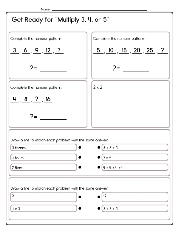 This math assessment workbook provides students with multiple opportunities to master the 3-, 4-, and 5-times tables. Through skip-counting number patterns, matching repeated-addition sentences to equivalent multiplication facts, selecting correct products, and filling in missing factors, children practice fluency with basic facts. They will learn to recognize equal groups and see the relationship between addition and multiplication. Word-style prompts such as "How many groups of fives make fifteen?" cultivate mathematical reasoning and introduce early division thinking. This workbook builds confidence and speed multiplying by 3, 4, or 5.