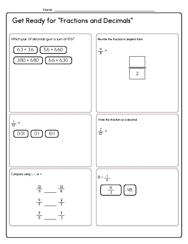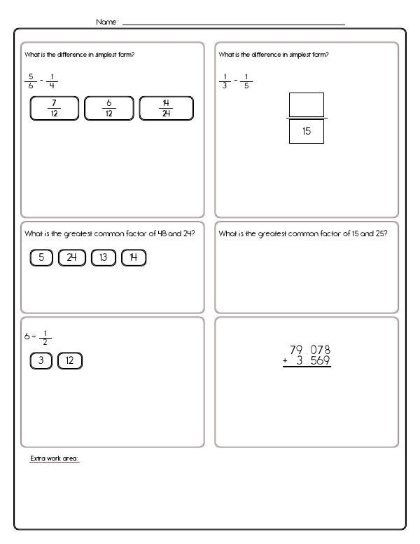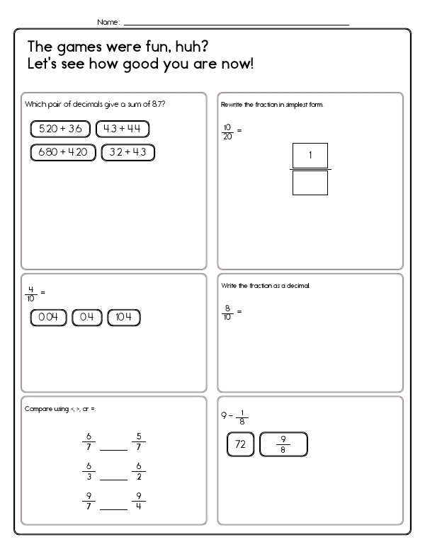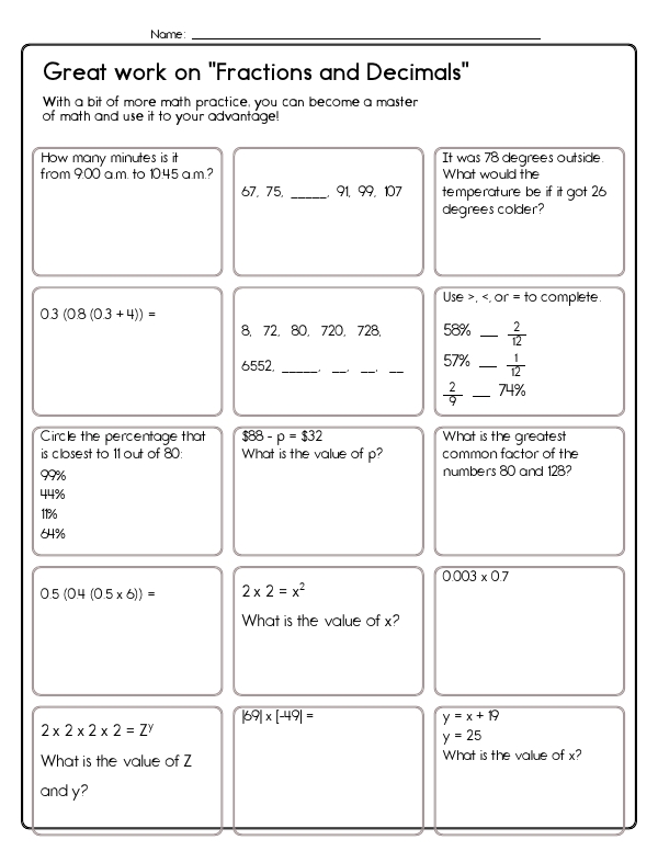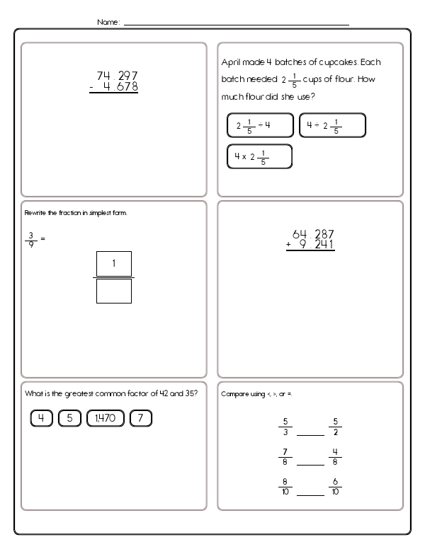 This math assessment workbook includes a variety of problems that involve decimals and fractions. Problems involve converting fractions to decimals, comparing fractional values, finding the greatest common factor of two numbers, and solving word problems that apply these skills in real-life scenarios. Students will also be assessed on reducing fractions, comparing fractions, and multiplying or dividing whole numbers and mixed numbers by fractions.