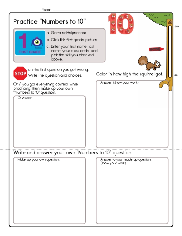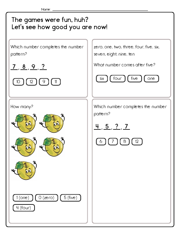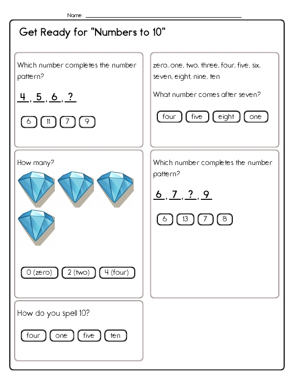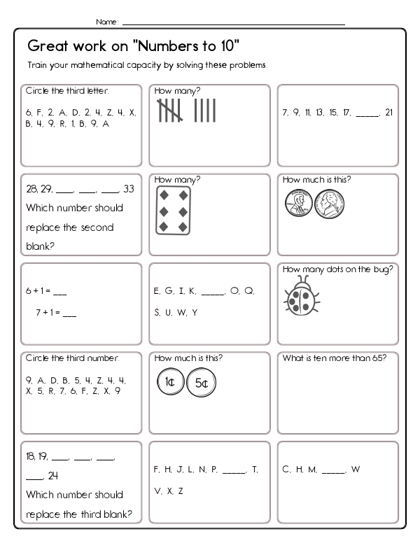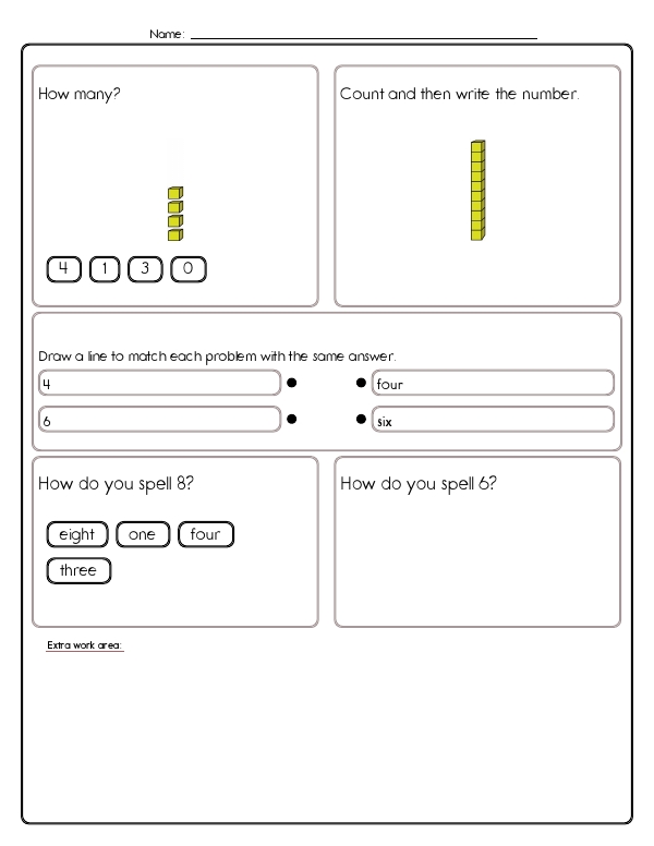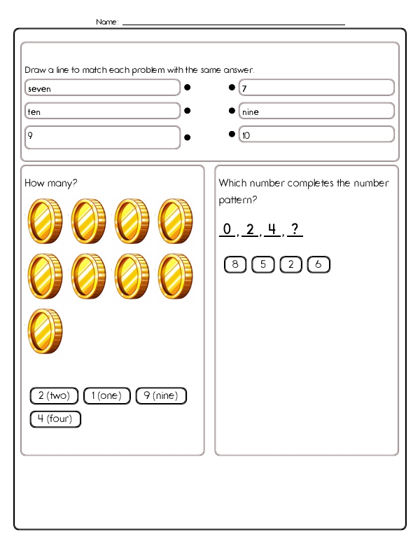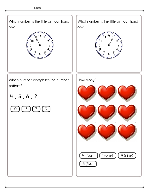 Now that kids have mastered counting to five, this next math assessment unit will let them practice counting from five to ten. This first-grade math unit includes a variety of problems designed to help them develop these skills. Problems include number sequences, counting, and spelling numbers. Many problems focus on recognizing and counting quantities through images. There are also matching exercises that connect numerical digits with their corresponding word forms. Additionally, students practice reading clock faces as a fun way to practice counting to 10. The common core skills emphasized in this unit include counting, understanding number relationships and patterns, and basic arithmetic.