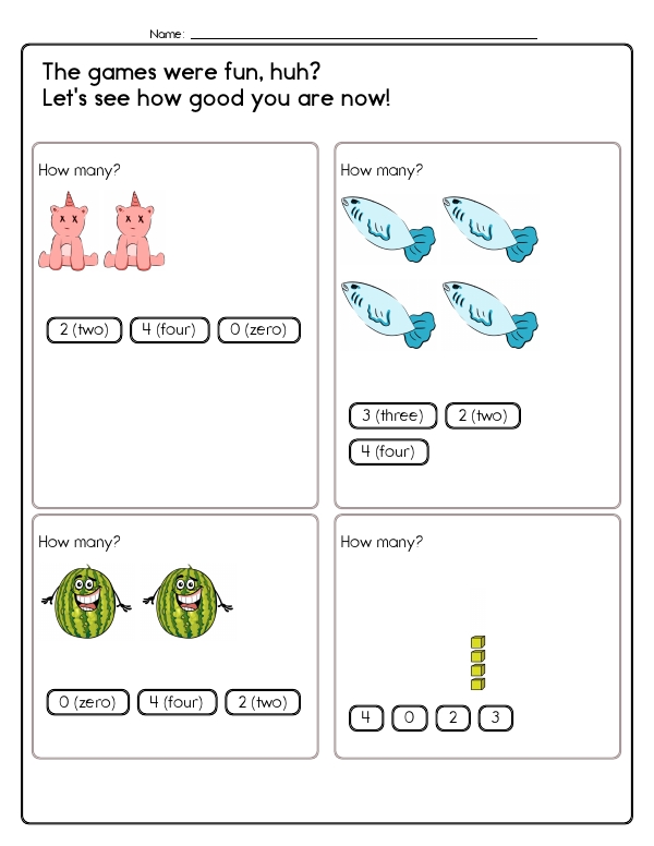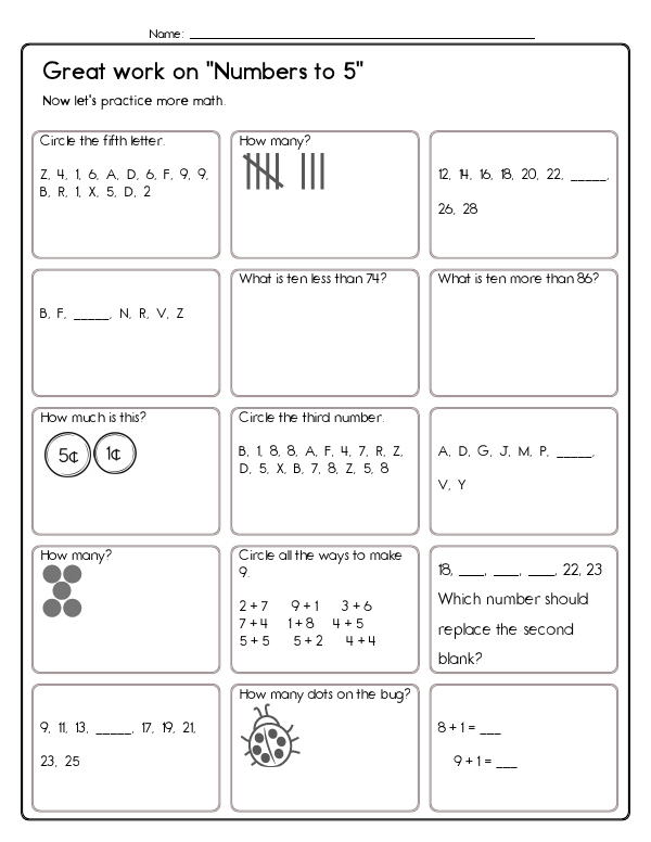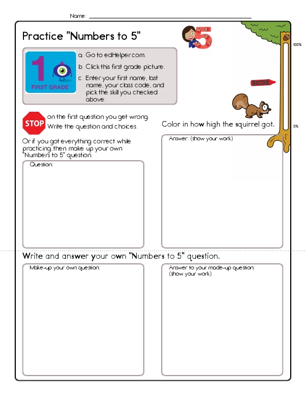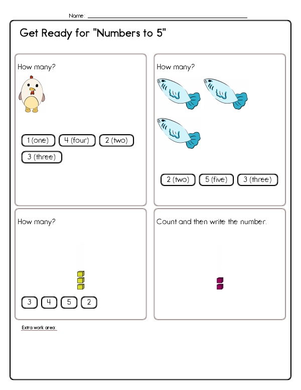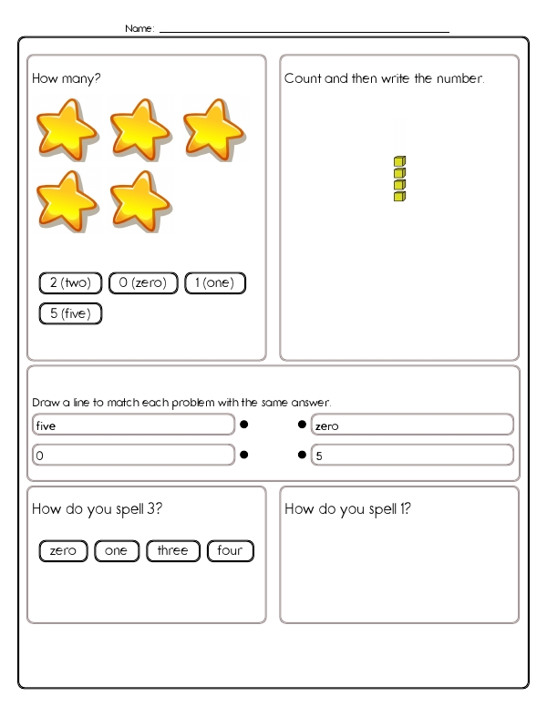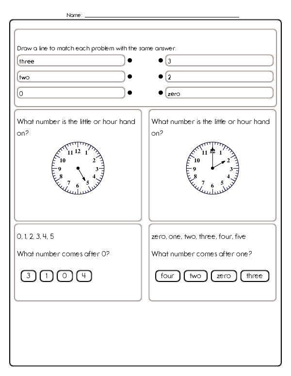 Students begin by counting pictures of animals and small items to choose the correct numeral. They also read and spell number words from zero to five. Place value blocks introduce the idea that a numeral stands for a set of objects. Matching activities ask learners to connect digits with number words or quantities. Simple clock questions let them read hours from one o'clock to five o'clock. Sequencing questions reinforce that each number has a successor. Common Core skills addressed include K.CC.1, K.CC.3, K.CC.4, K.CC.5, 1.NBT.2, and 1.MD.3.