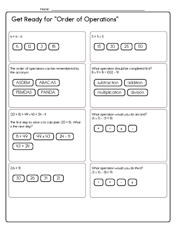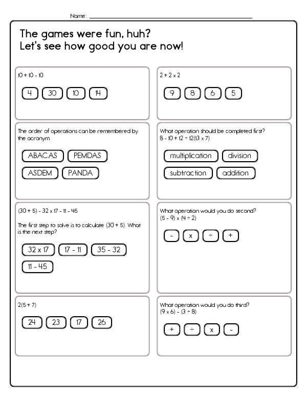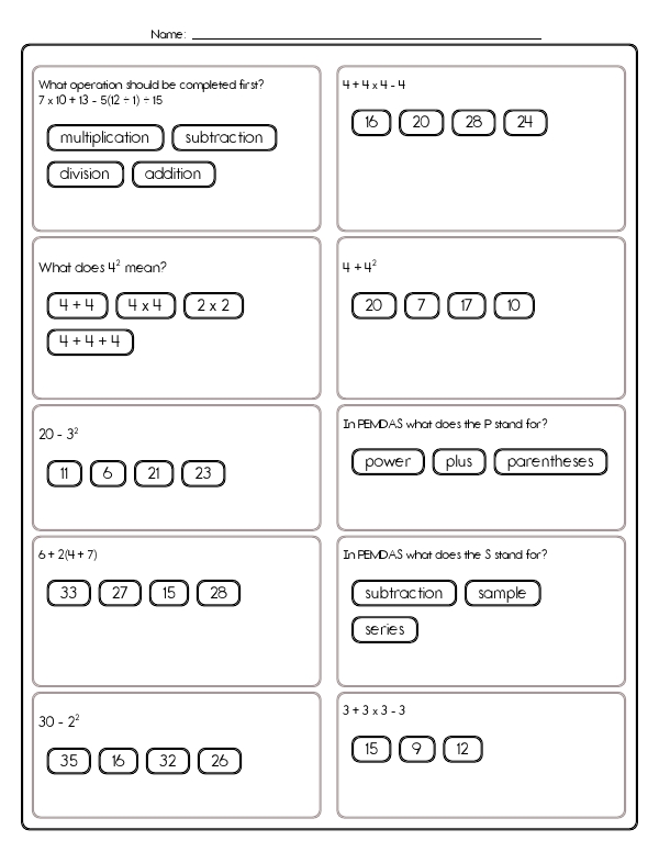 This math assessment focuses on evaluating and solving mathematical expressions using the correct order of operations. Kids need to remember the order by using the acronym PEMDAS (Parentheses, Exponents, Multiplication and Division, Addition and Subtraction). Students engage with problems that require them to apply these operations in the correct sequence to solve arithmetic expressions accurately. Common Core skills covered in this unit include using parentheses in numerical expressions and evaluating expressions using the PEMDAS method.