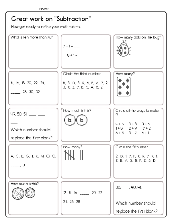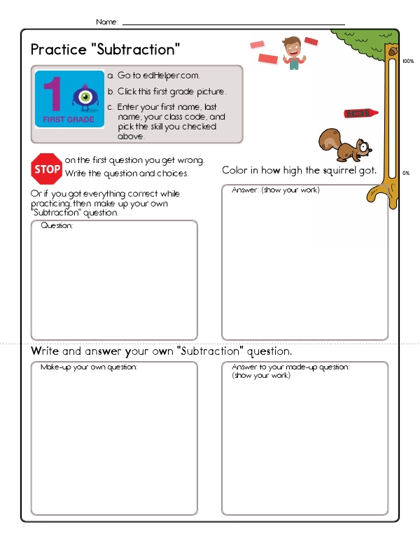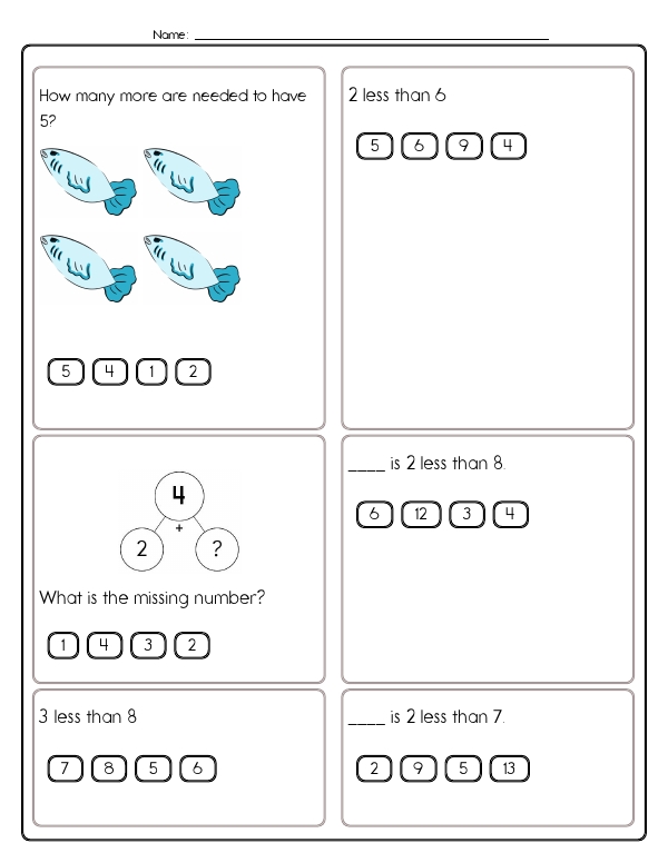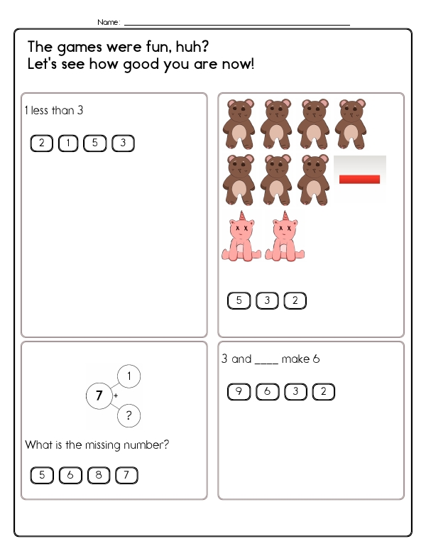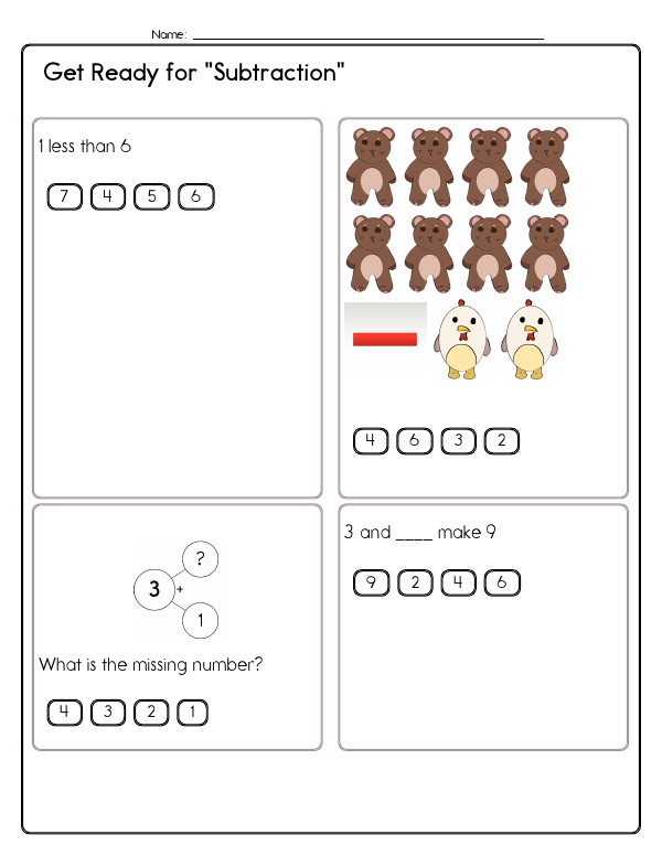 Now that kids can order numbers to 10 and count on by adding one or two, it is time to tackle taking away a number or two! This unit introduces first graders to subtraction and number relationships within ten. Students are encouraged to uncover "number mysteries" by identifying what is "one less" or "three less" in a fun and interactive way with colorful animal images. Number bond puzzles ask them to find a missing addend that combines with a given part to reach a target sum. Most problems offer four choices, which encourages quick fact recall and confidence with simple equations. Common Core skills addressed are 1.OA.A.1, 1.OA.C.5, and 1.OA.C.6.