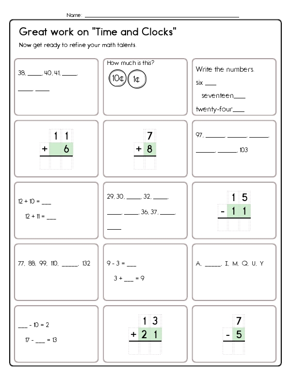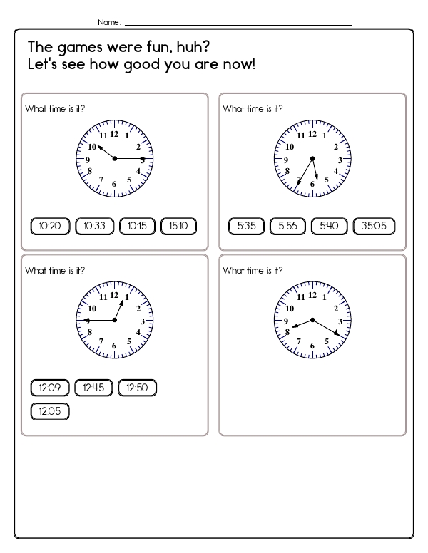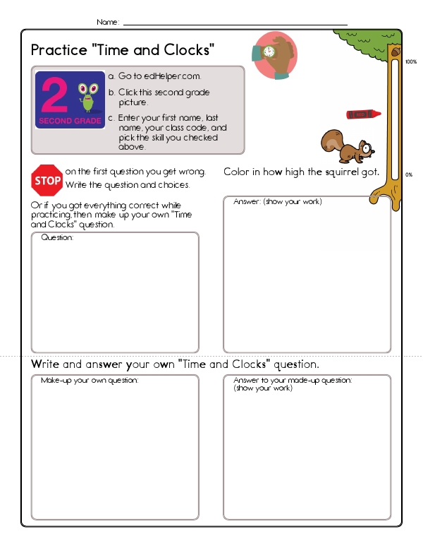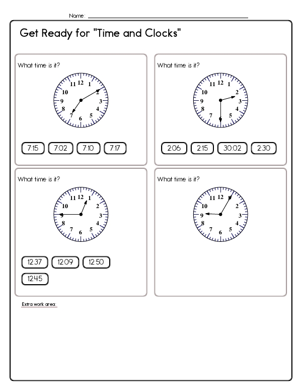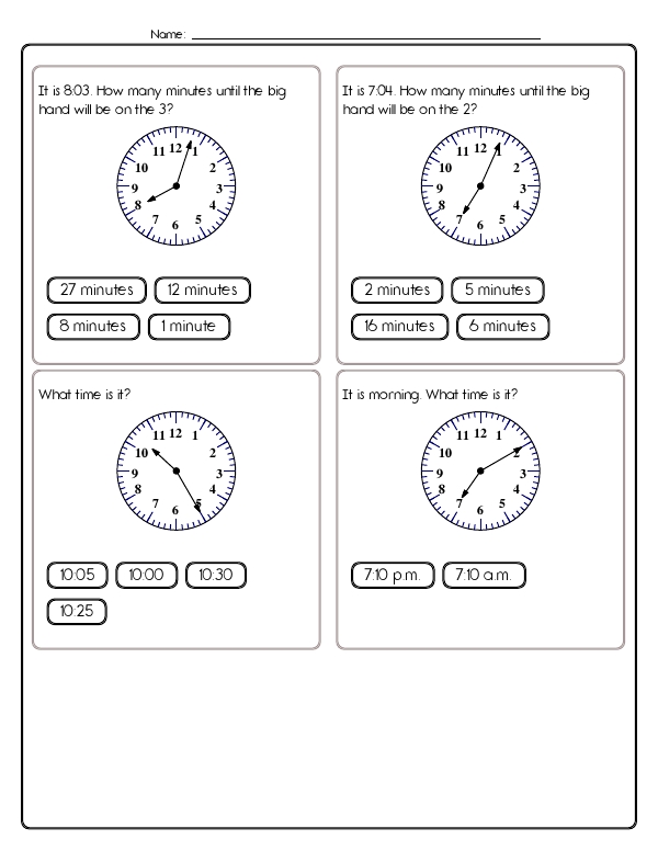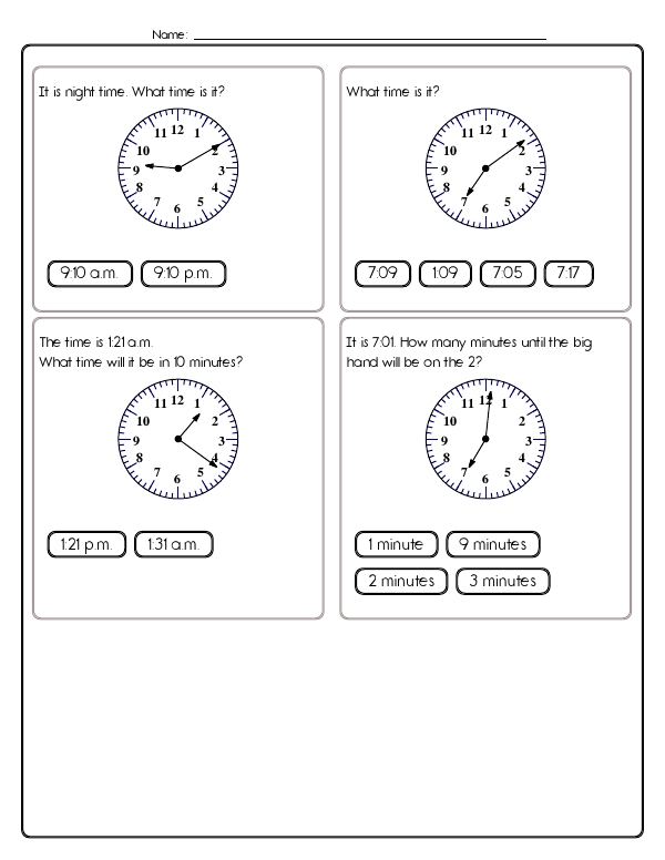 This math assessment workbook gives children practice with clocks. Students view dozens of clock faces and choose the matching digital time to the nearest hour, five minutes, or exact minute. Multiple-choice questions challenge kids to distinguish a.m. from p.m., calculating elapsed time (e.g., "What time will it be in 10 minutes?"), and finding how many minutes remain until the minute hand reaches another number. This workbook is designed to help second-grade students apply their common core skills in telling time and understanding clocks.