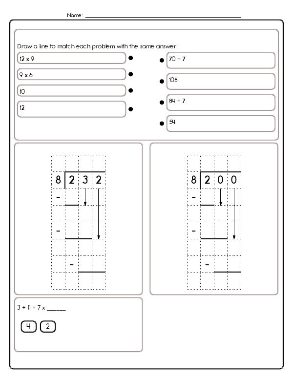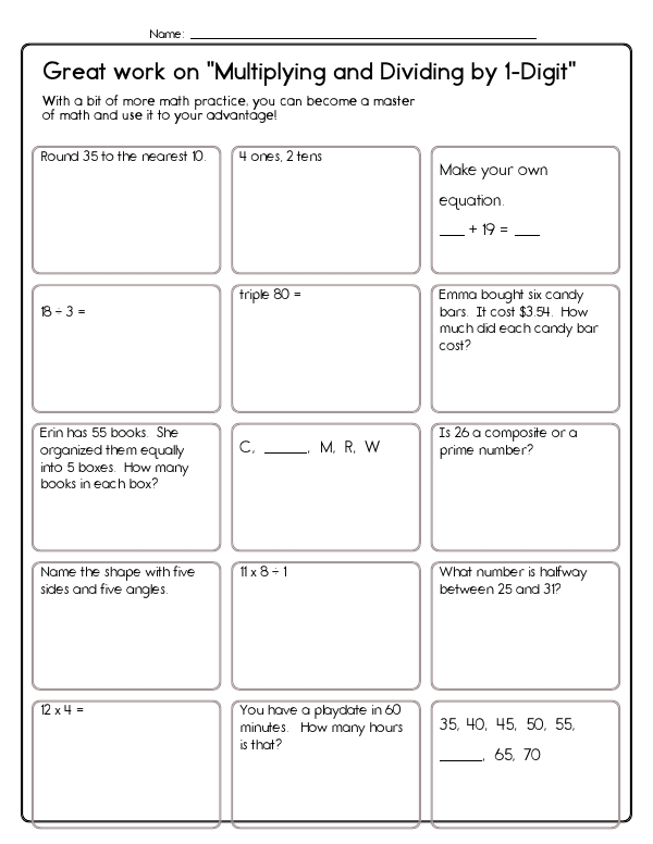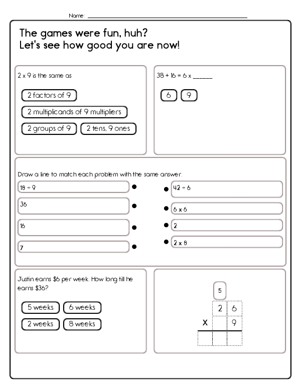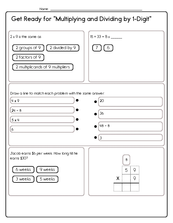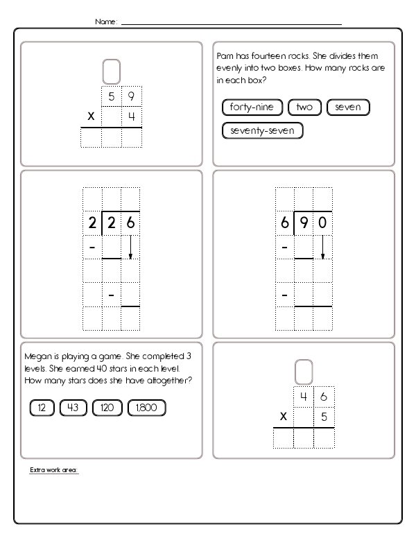 This math assessment workbook provides teachers with a ready-made assessment that targets multiplication and division with single digit factors. Students will practice this skill with related fact equations, multi-step word problems, and simple equivalence questions, such as 5 x 8, which is the same as 5 groups of 8. Kids will solve equal sharing situations, such as dividing rocks into boxes, and they connect division to repeated subtraction. The workbook includes procedural practice with multi-digit by one-digit multiplication using partial products. It also features long division of up to three-digit dividends by one-digit divisors, with some solutions provided to verify the process. Common Core standards convered include 4.OA.A.1 and 4.OA.A.2, as well as 4.NBT.B.5 and 4.NBT.B.6.